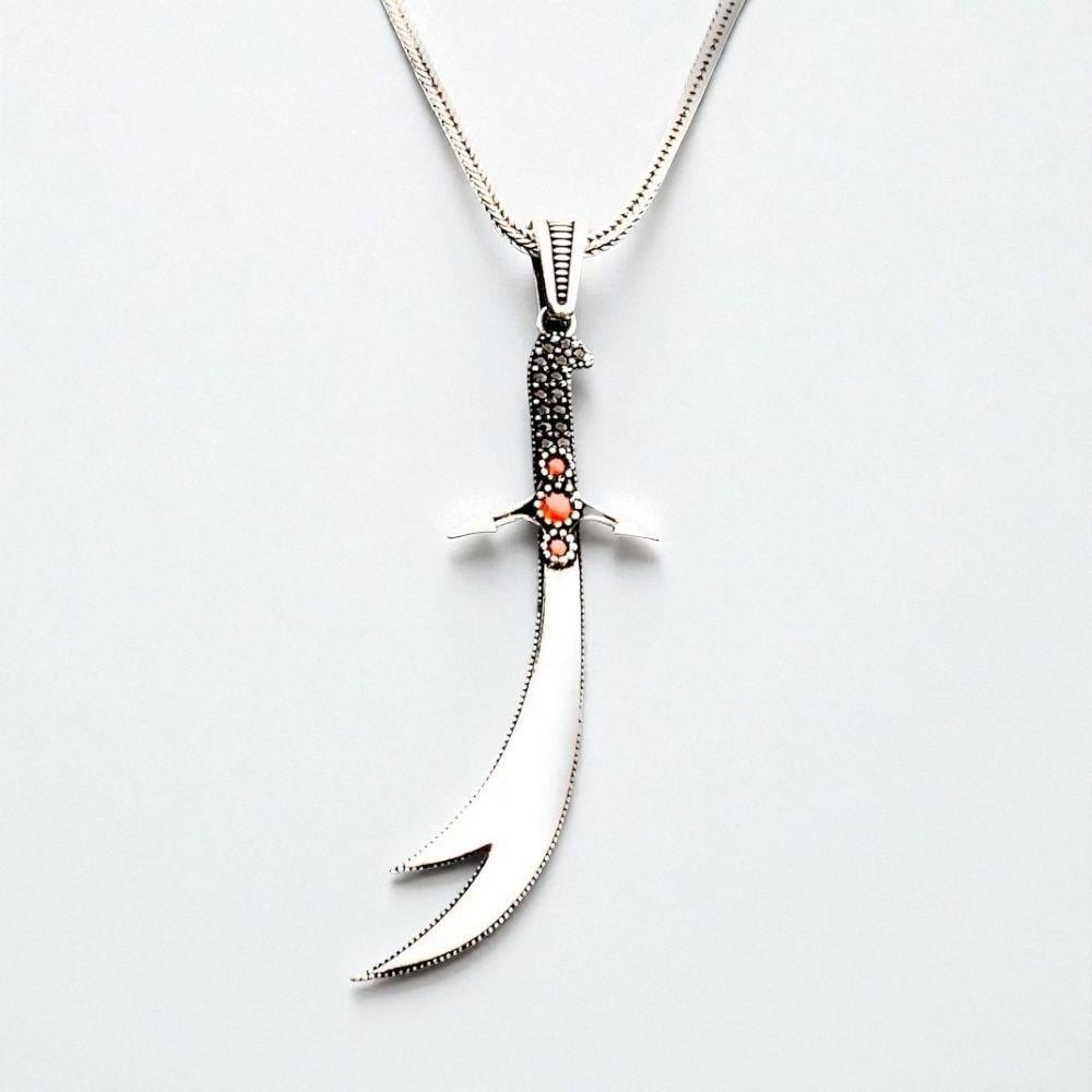 925 Sterling Silver Zulfiqar Sword Pendant with Red Stone – Fox Tail Chain