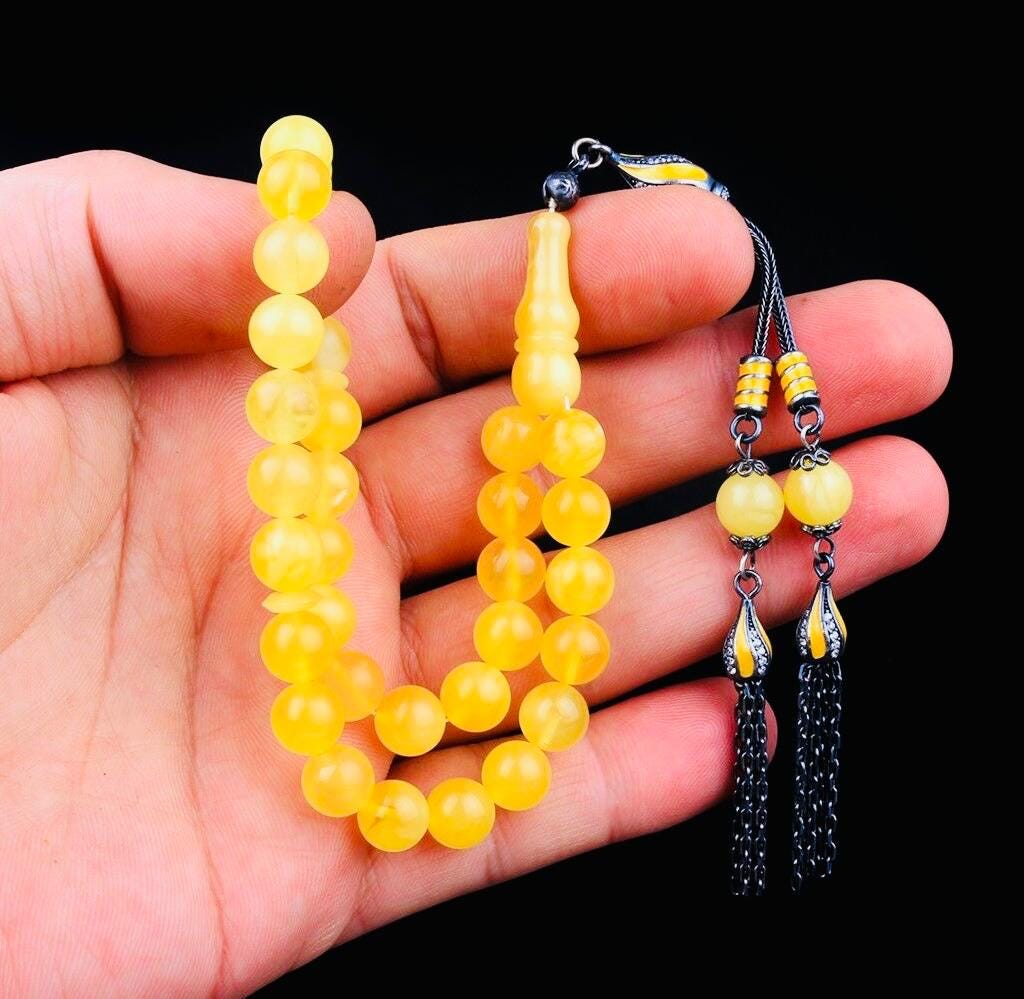 Custom-designed damla amber misbaha featuring fine 8×5 mm beads and a genuine silver tassel. Ideal for daily prayer, meditation, or as a meaningful gift.
