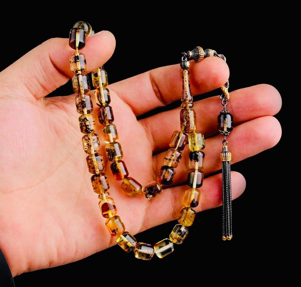 Double Tone Fossil Amber Misbaha with Silver Tassel – Capsule Cut