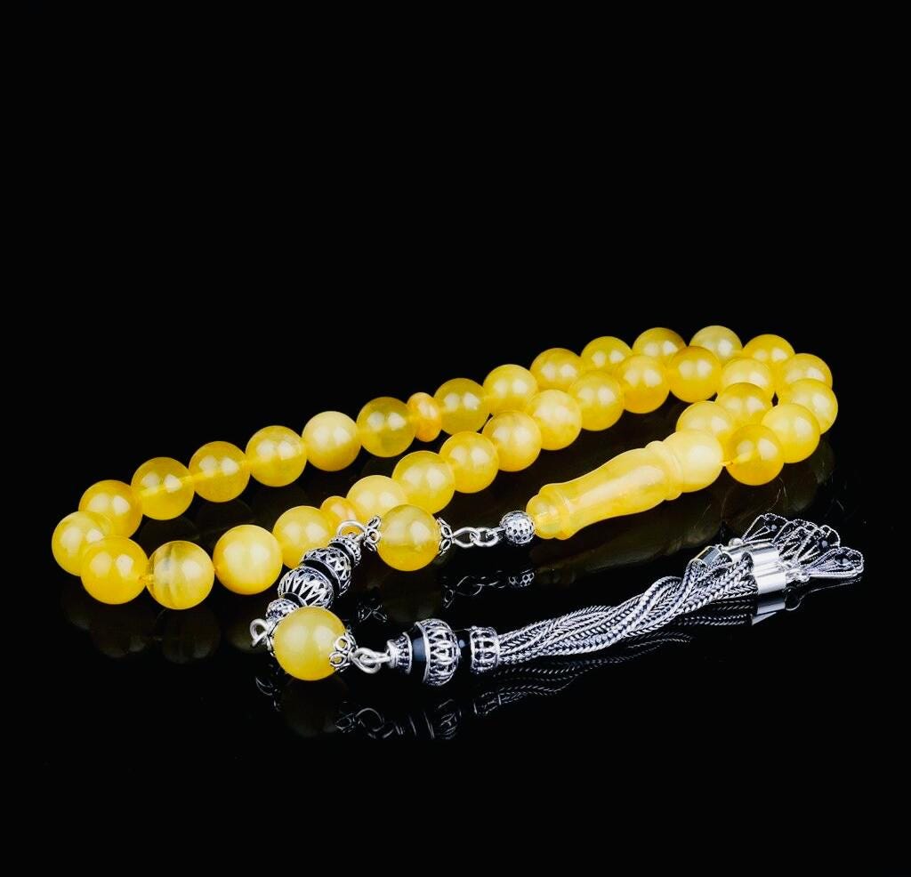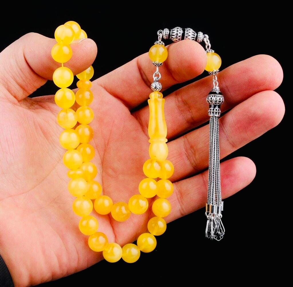 High-quality 9.5 mm yellow amber misbaha paired with an enamel-detailed 925 sterling silver tassel. Ideal for dhikr, meditation, collecting, or gifting.