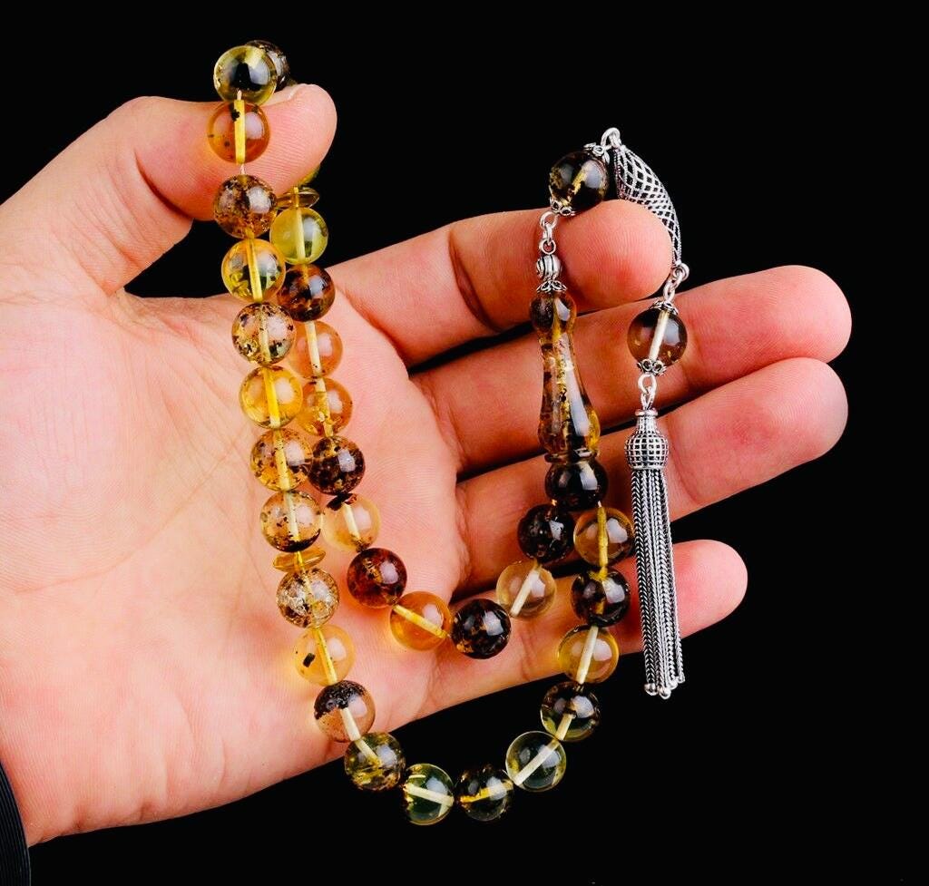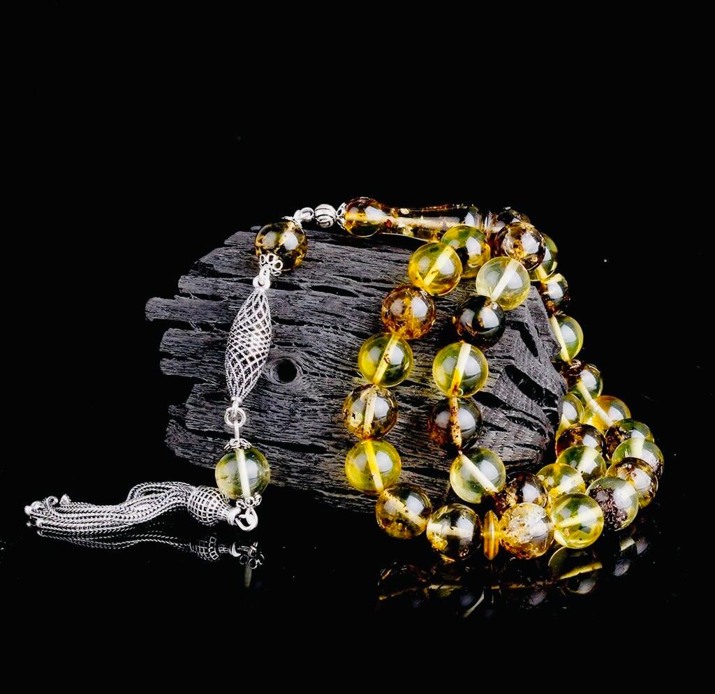 Elegant fossil amber misbaha featuring 10.5mm beads in yellow–black tones, completed with a 925 sterling silver tassel. A meaningful piece for dhikr, meditation, or gifting.