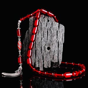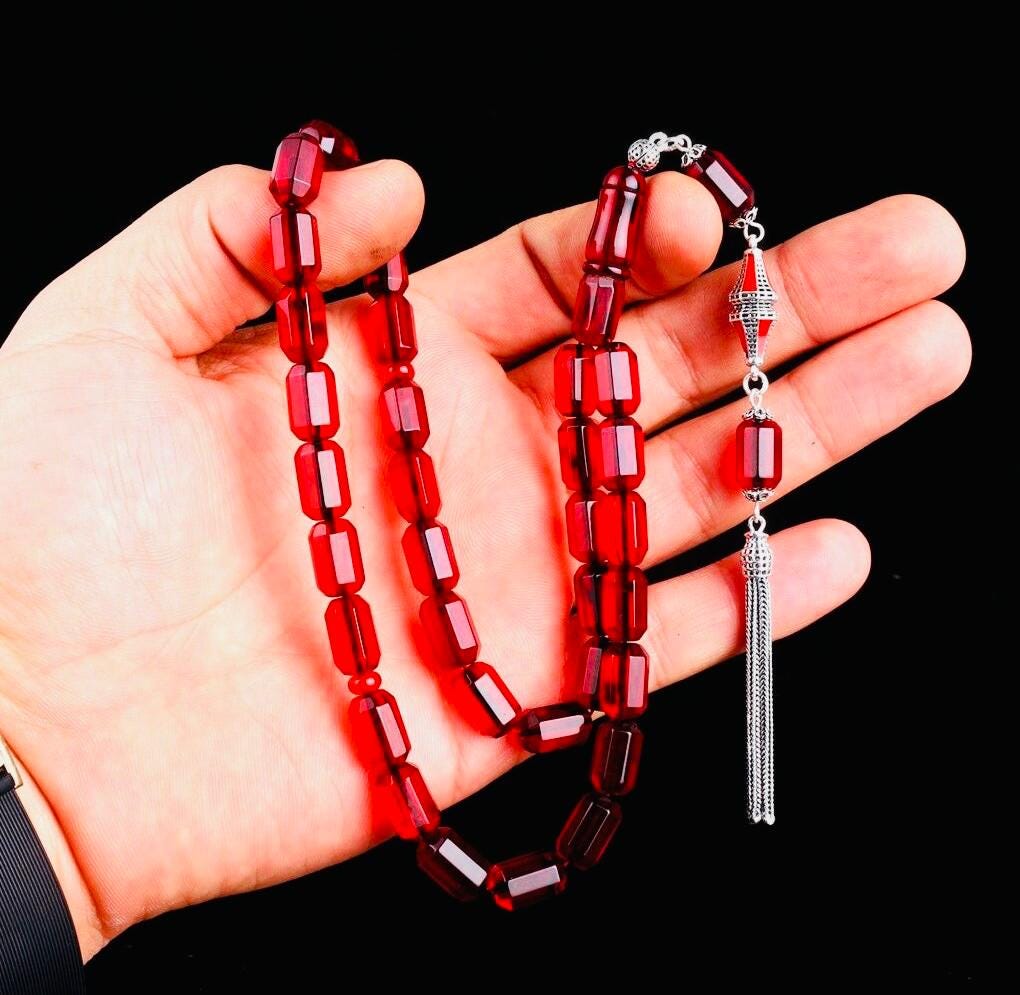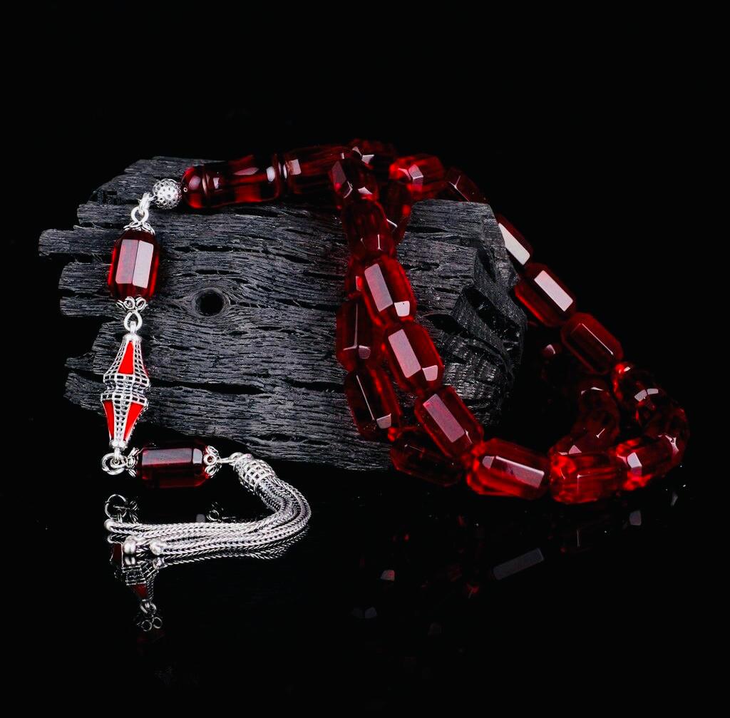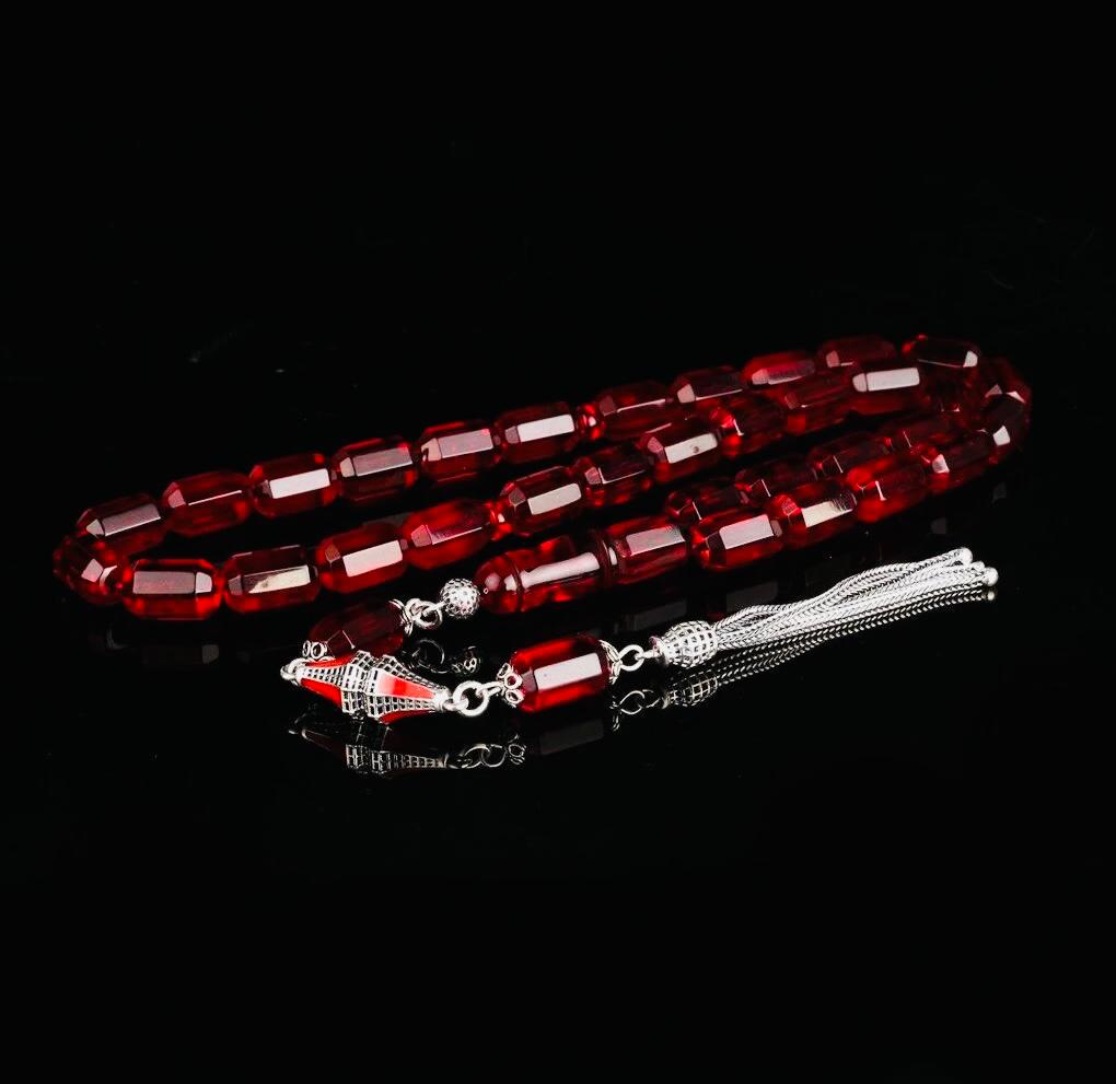 Red Faceted Amber Tasbih with 925 Sterling Silver Tassel