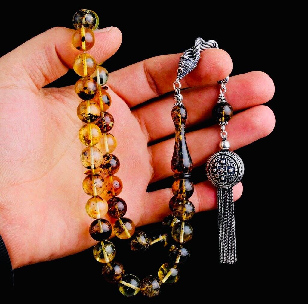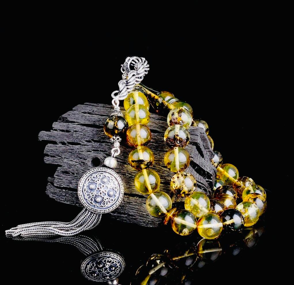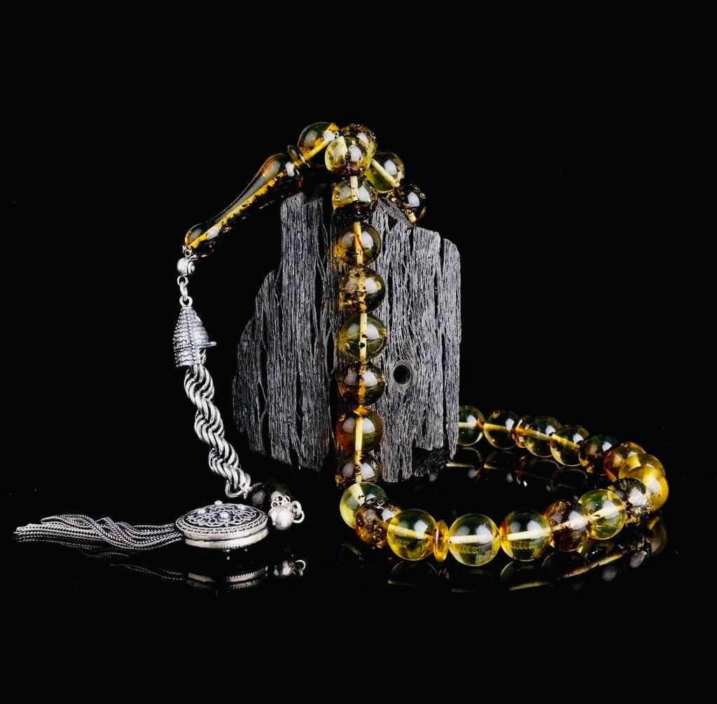 Elegant fossil amber misbaha with round 11.5 mm beads, completed with a 925 sterling silver tassel. The natural yellow–black tones and substantial weight make this a premium collectible tasbih and a meaningful gift option.