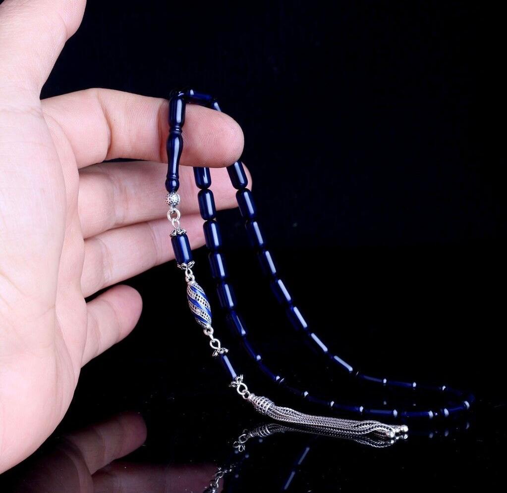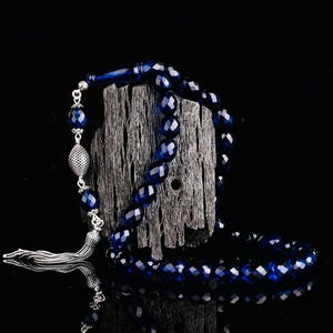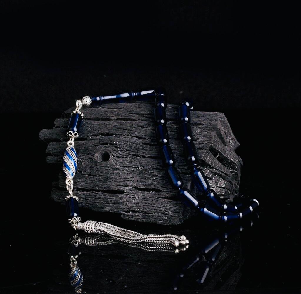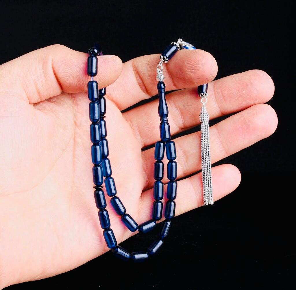 A refined capsule-cut blue amber tasbih completed with a 925 sterling silver tassel. Its elegant bead form and deep color make it a meaningful misbaha for daily use, meditation, or gifting.