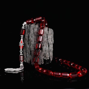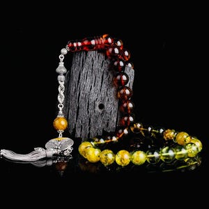 Details * Bead size: 5 × 9 mm * Misbaha length: 31 cm * Imame length: 3.5 cm * Material: Natural amber * Tassel: 925 sterling silver * Gift box included