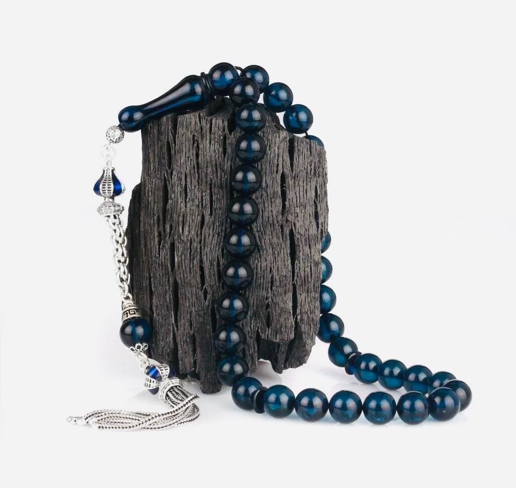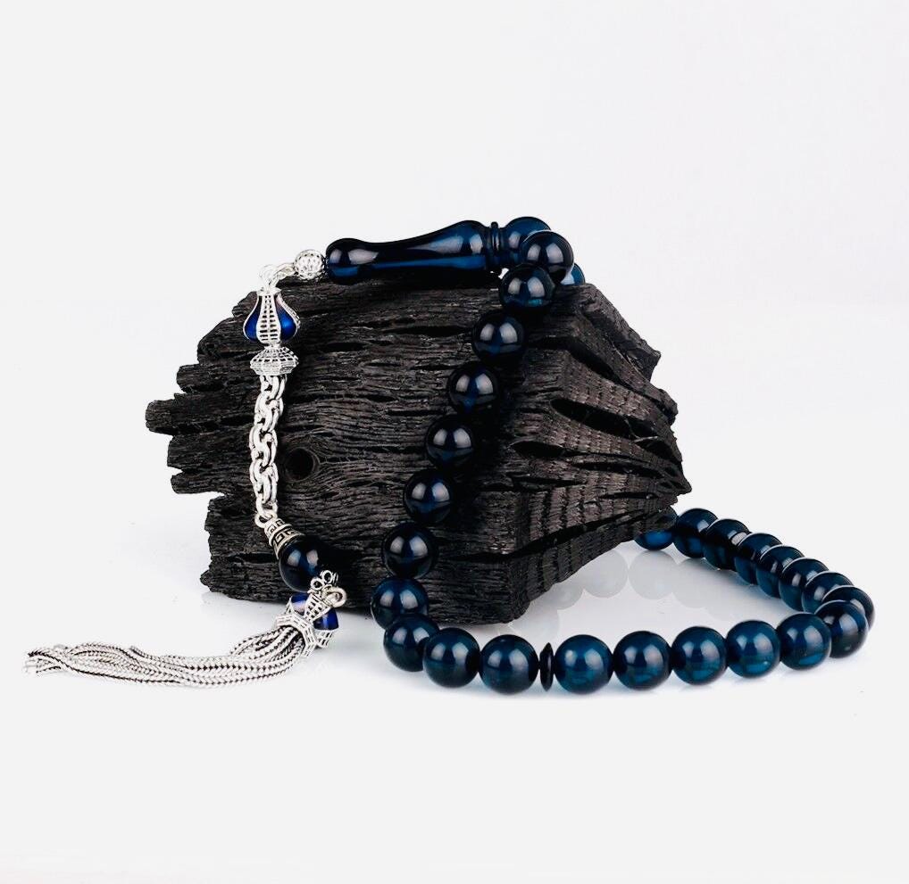 Elegant blue genuine amber misbaha paired with a 925 sterling silver tassel. Smooth beads and a rich color tone make this tasbih a meaningful gift and a unique collectible piece.
