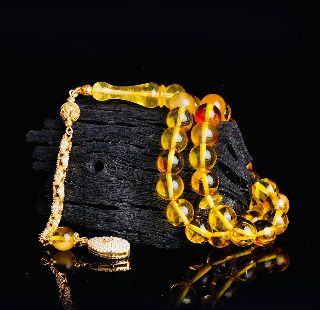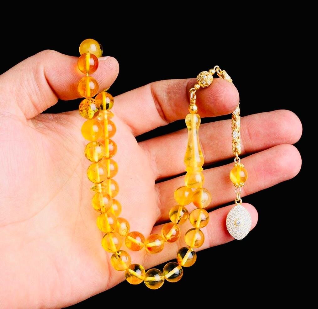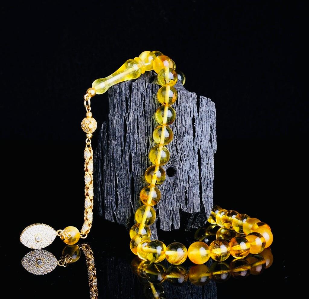 Genuine amber misbaha featuring a 925 sterling silver tassel and zircon stone detailing. Smooth 9.5 mm beads and balanced craftsmanship make it a perfect gift, collectible, or everyday prayer bead.
