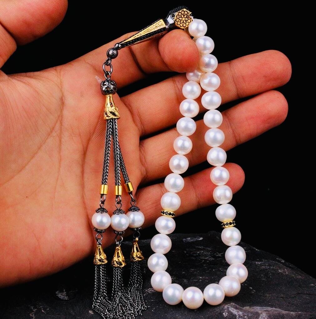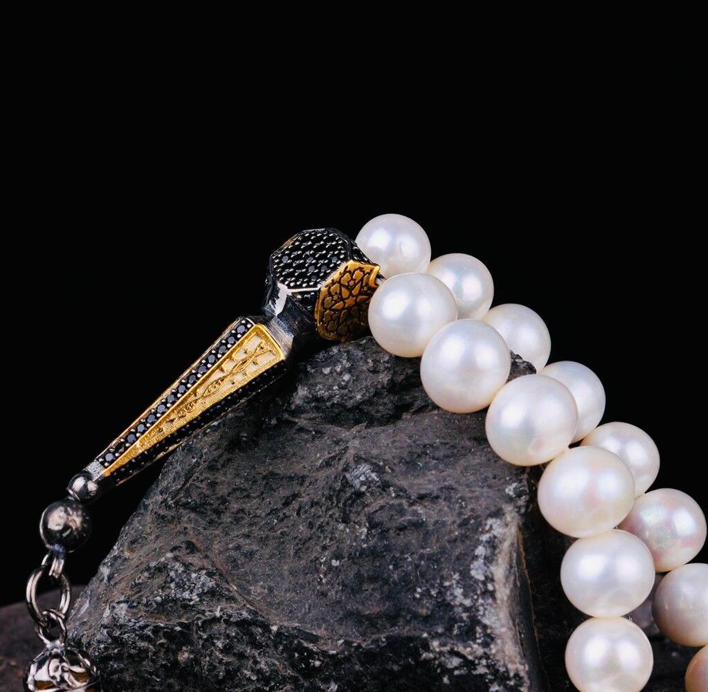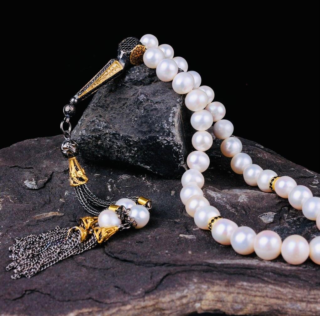 A premium misbaha featuring 10 mm natural pearl beads in yellow–black tones, completed with a gold-plated 925 sterling silver tassel. A refined and elegant design—perfect for dhikr, meditation, gifting, or daily use.