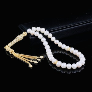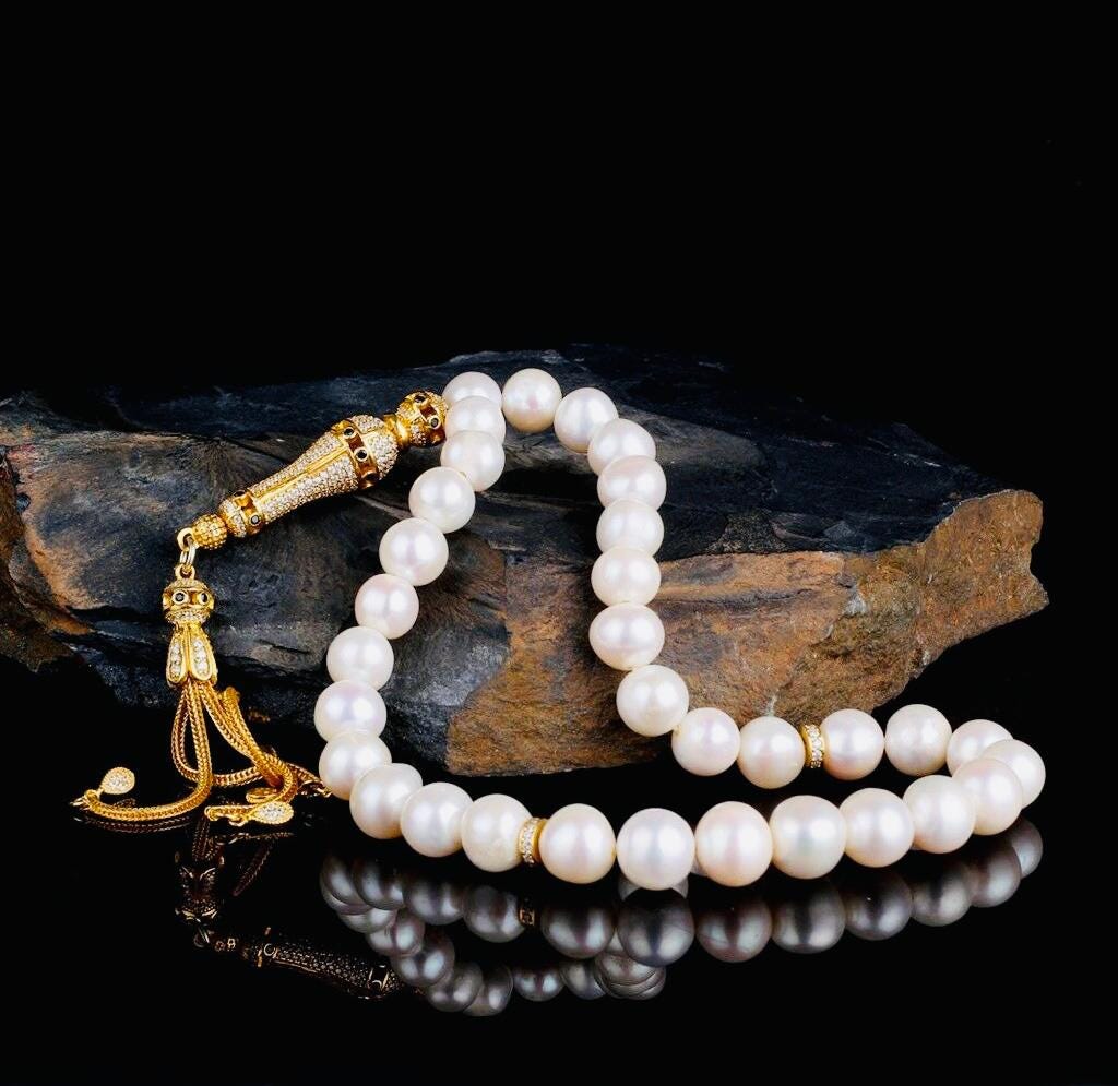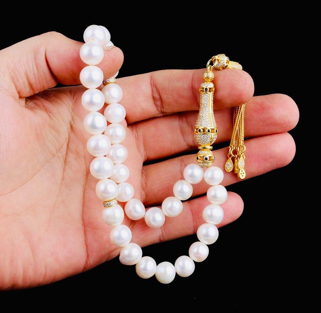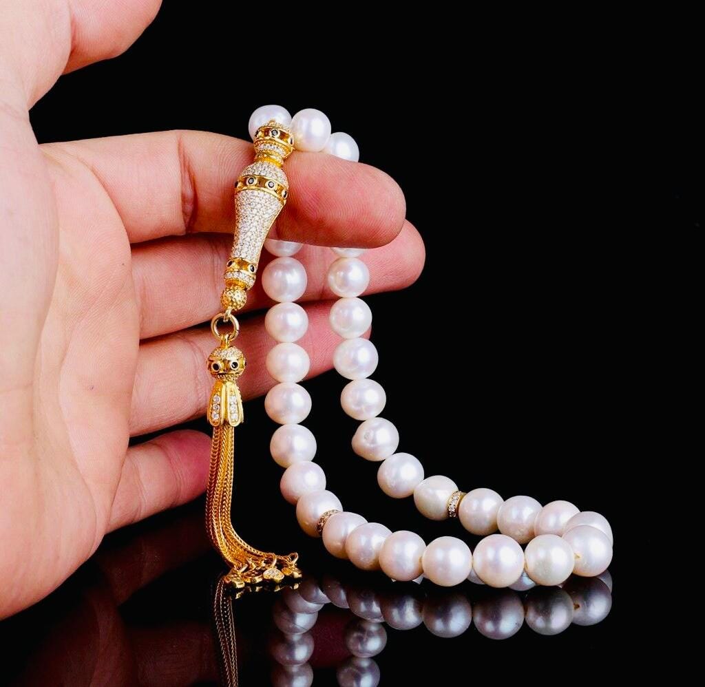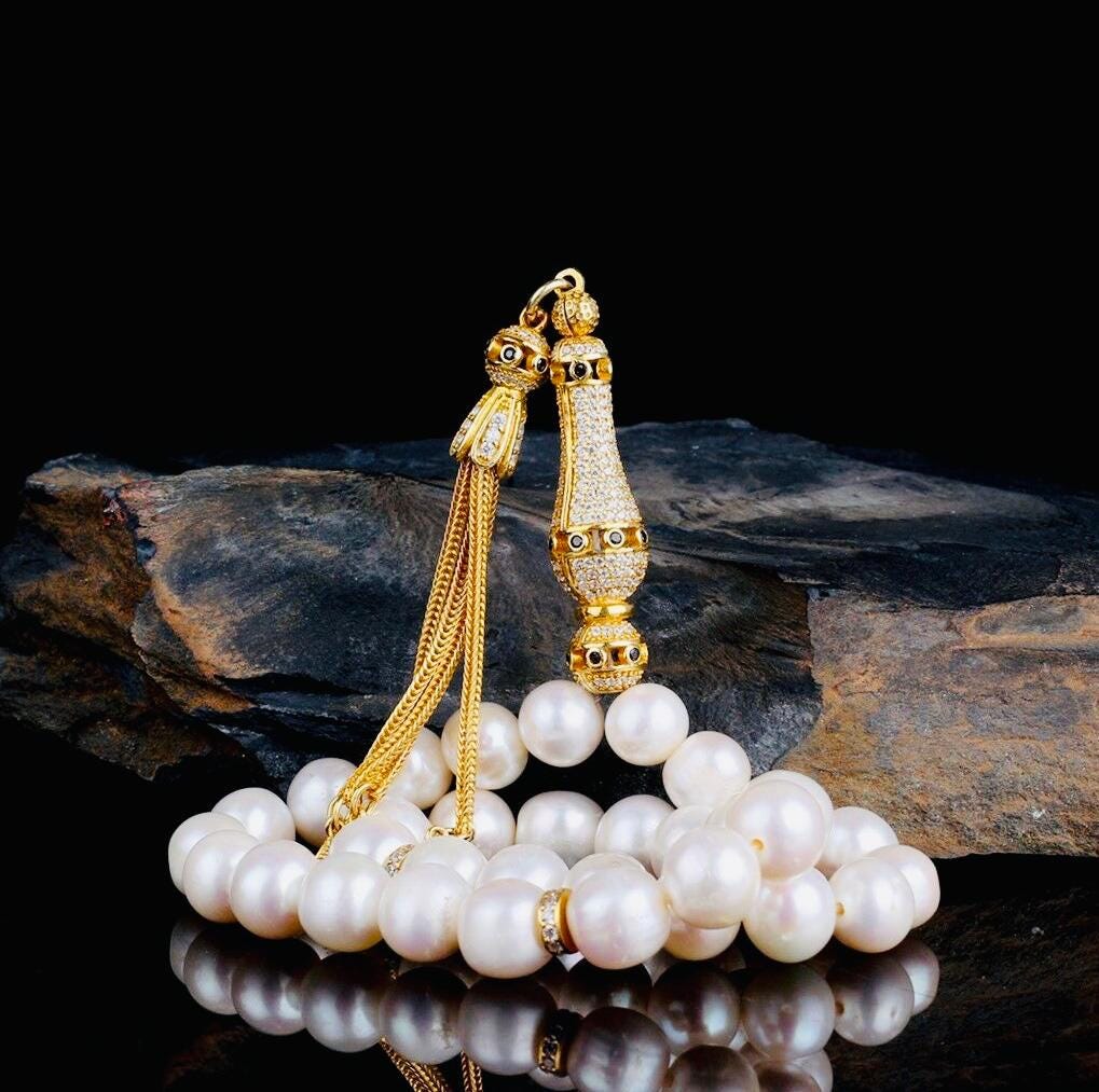 Elegant misbaha designed with 10mm natural pearl beads and a gold plated, zircon-detailed silver tassel. Perfect for dhikr, meditation, gifting, or personal collection.
