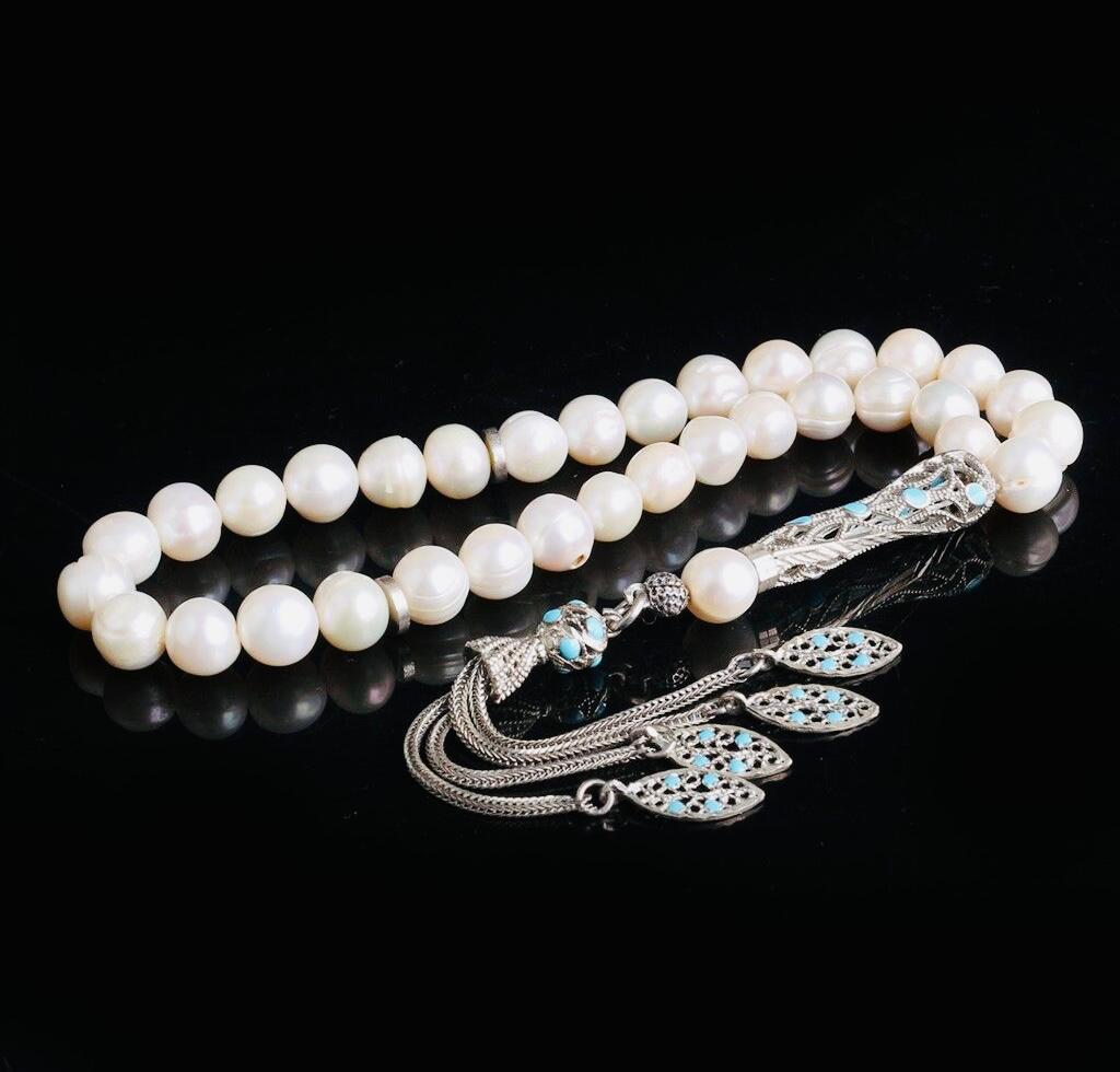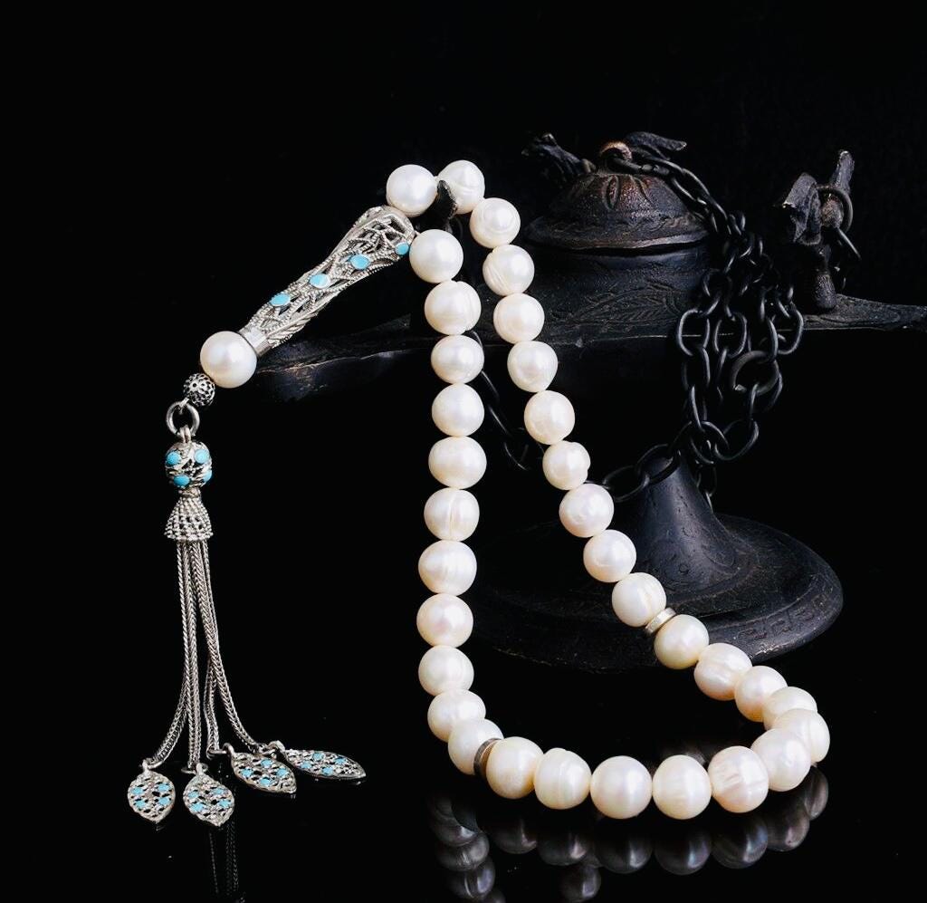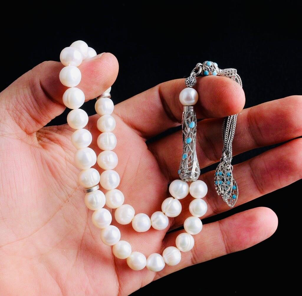 Elegant misbaha crafted with natural cultured pearl beads and a beautifully detailed 925 sterling silver enamel tassel. Perfect for daily dhikr, meditation, gifting, or personal collection.