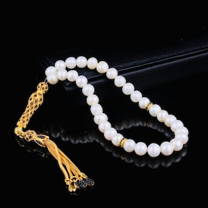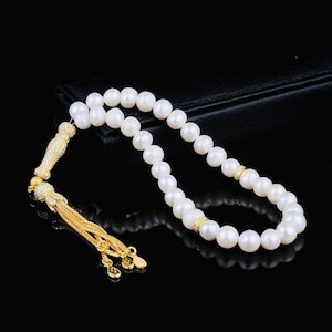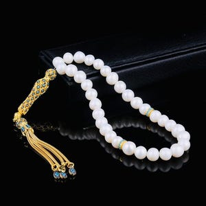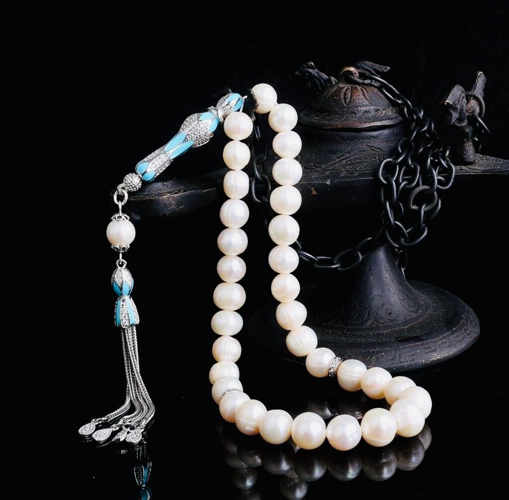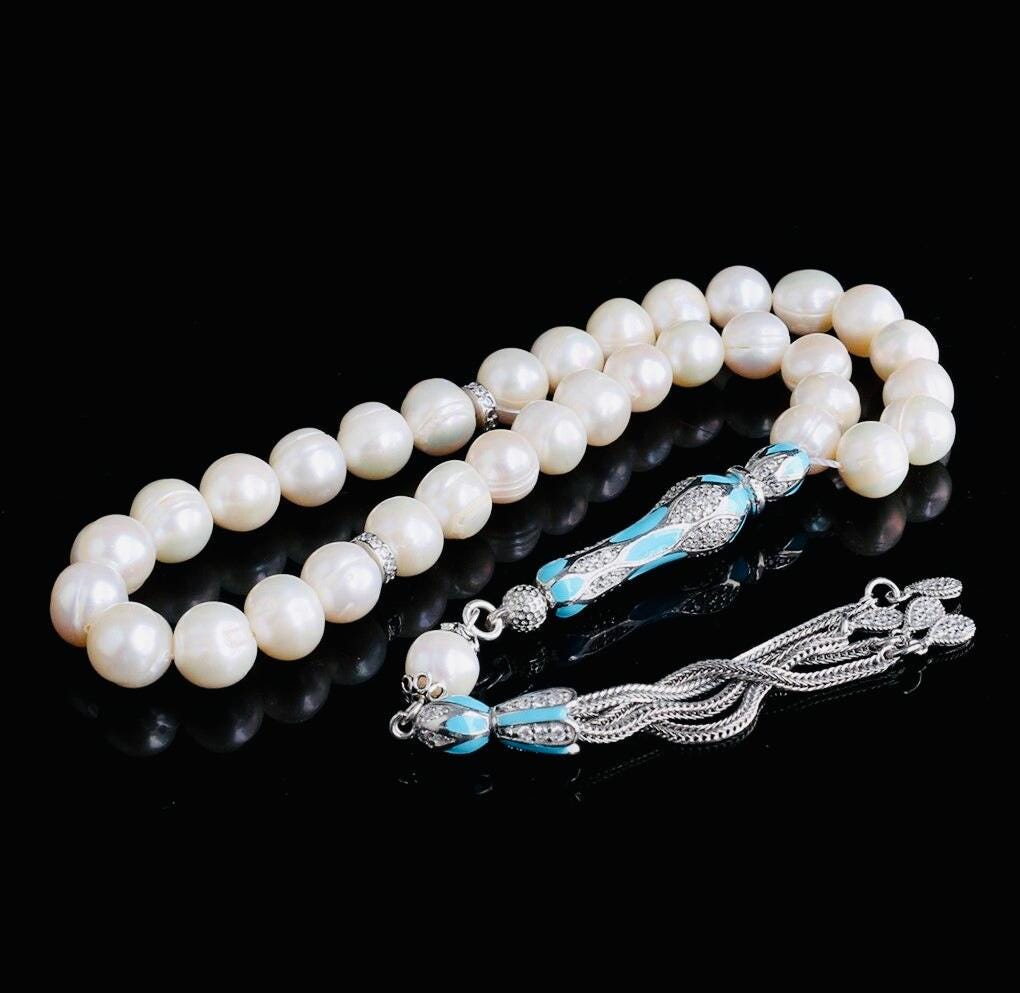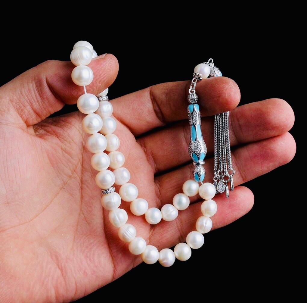 A refined misbaha featuring natural cultured pearl beads paired with an elegant 925 sterling silver enamel-coated tassel. Perfect for dhikr, meditation, gifting, or personal collection.
