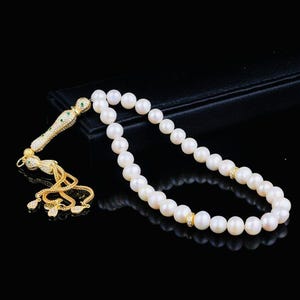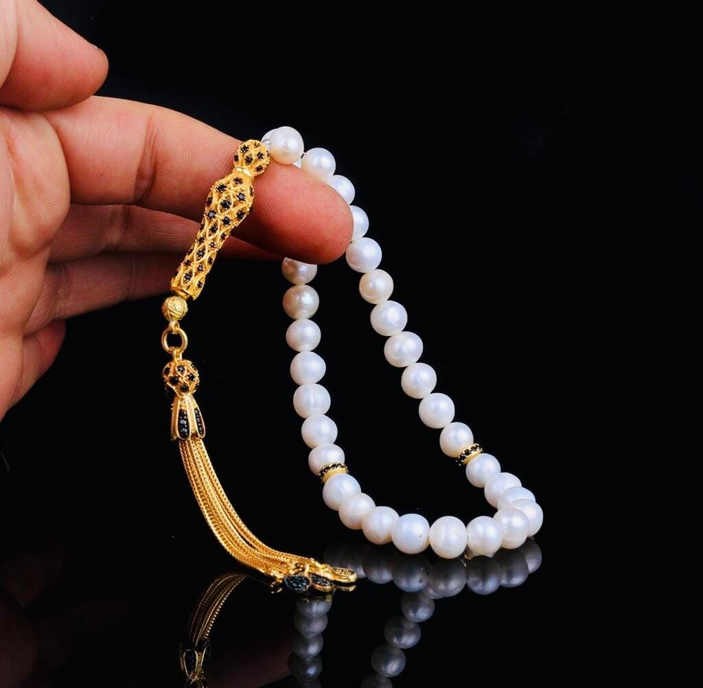 A premium wrist-size misbaha crafted with 8mm pearl beads, gold-plated silver set tassel, and sparkling zircon stones. Designed for elegance and comfort—perfect for daily dhikr, meditation, or gifting.