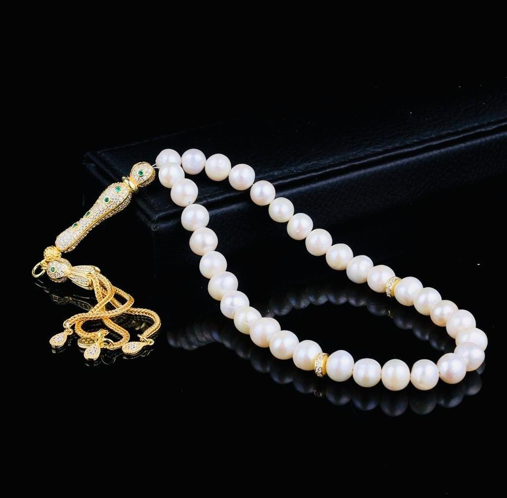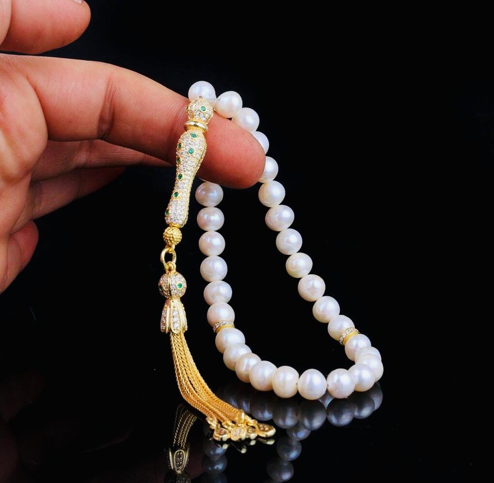 A refined wrist-size pearl tasbih featuring 8mm natural pearl beads and a gold plated silver set tassel with zircon-style shine. Perfect for dhikr, meditation, or elegant gifting.