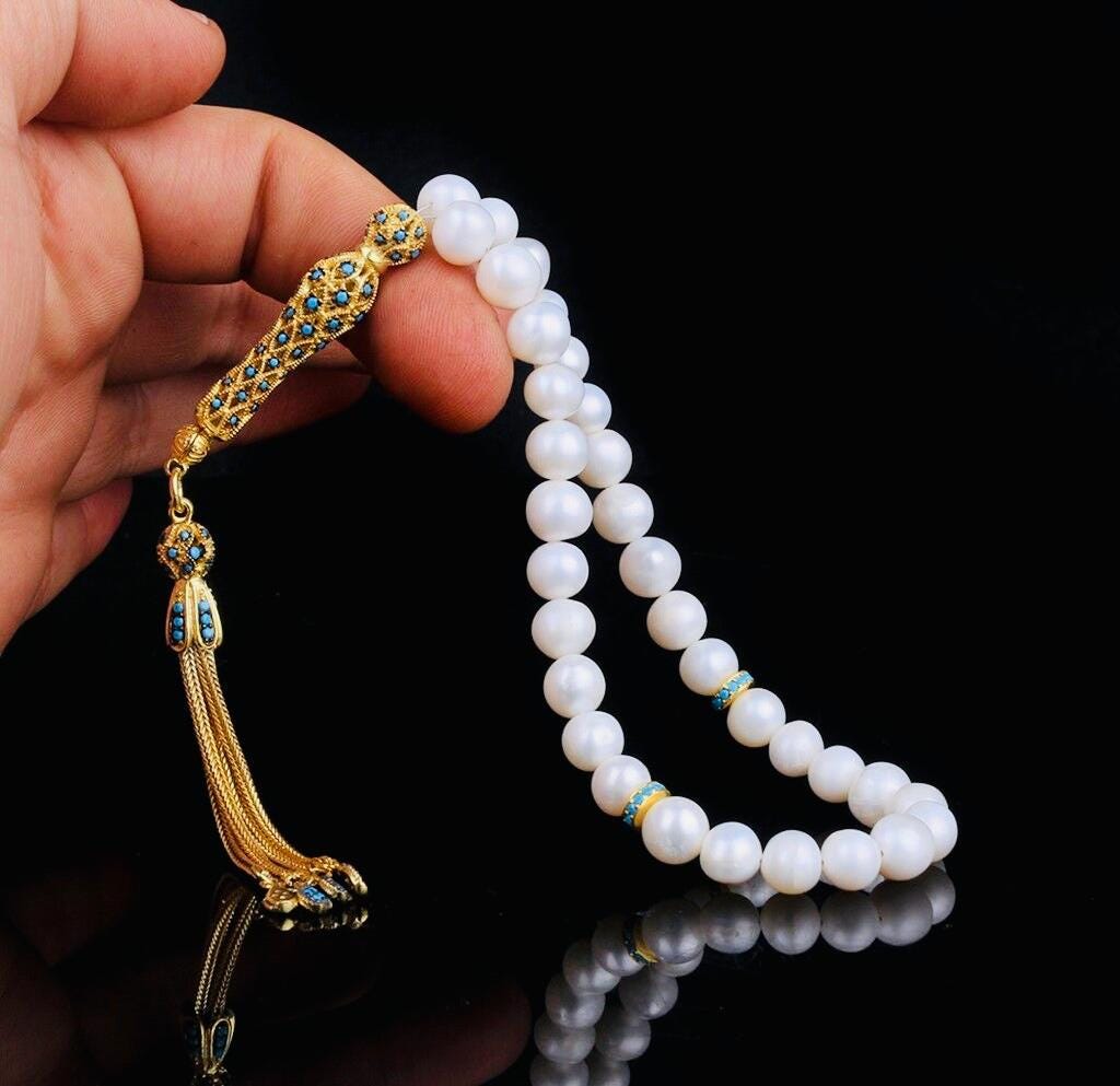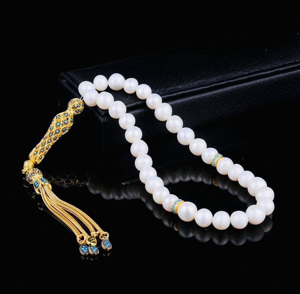 A beautifully crafted wrist-size misbaha featuring 8 mm pearl beads, a gold-plated silver tassel, and sparkling zircon stones. Perfect for dhikr, meditation, gifting, or adding elegance to your collection.