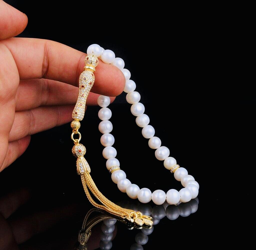 Gold Plated Zircon Silver Set Pearl Misbaha – 8 mm Wrist Size Tasbih A refined wrist-size pearl misbaha featuring 8 mm natural cultured pearls and an elegant gold-plated silver tassel with zircon stones. Perfect for daily dhikr, meditation, gifting, or collectors who appreciate luxury craftsmanship.
