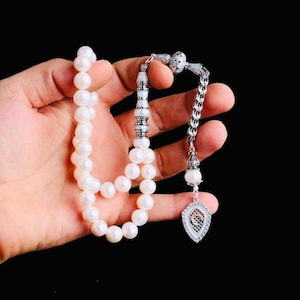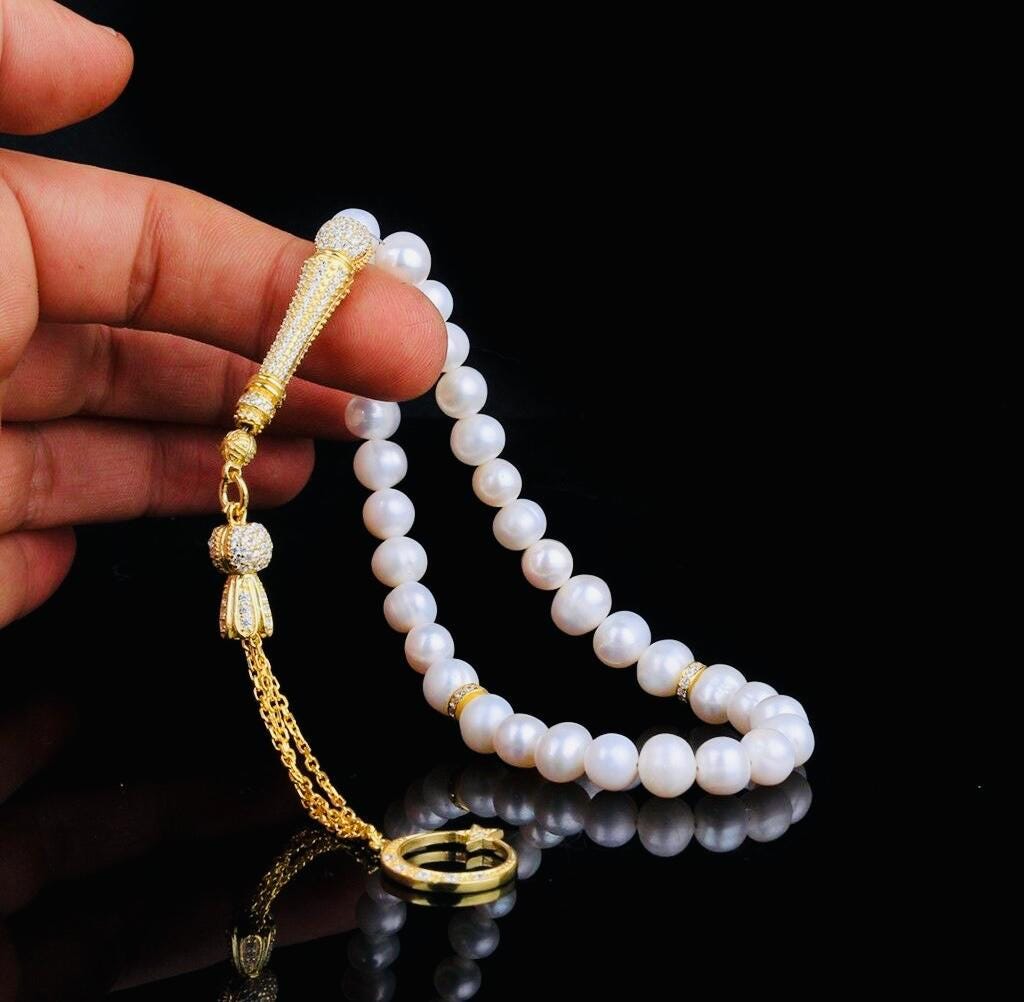 Elegant pearl misbaha featuring 8 mm natural cultured pearls, a gold-plated silver tassel with Ayyildiz and zircon detailing, and a compact wrist-size design. Perfect for daily dhikr, meditation, gifting, or collectors.