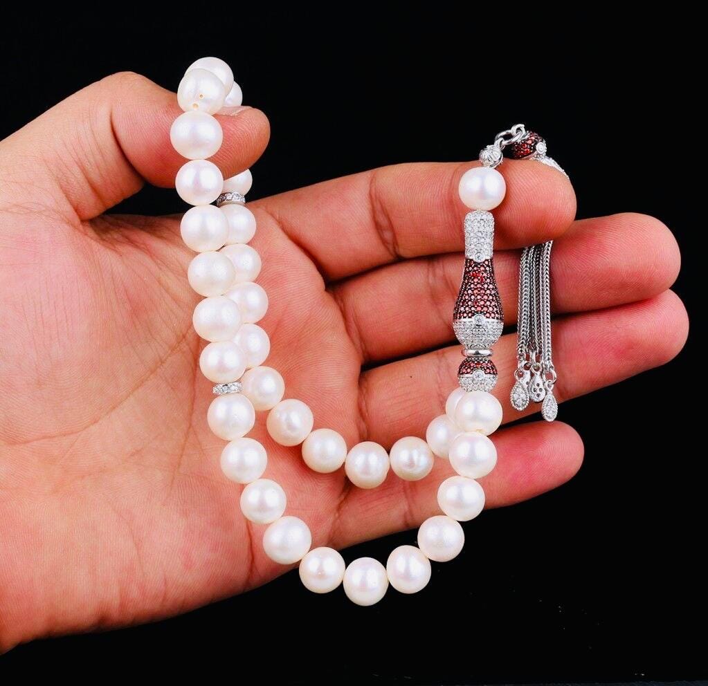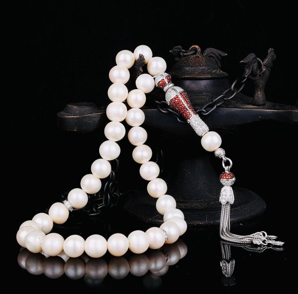 Natural Pearl Tasbih with Zircon Tassel – 10 mm Prayer Beads