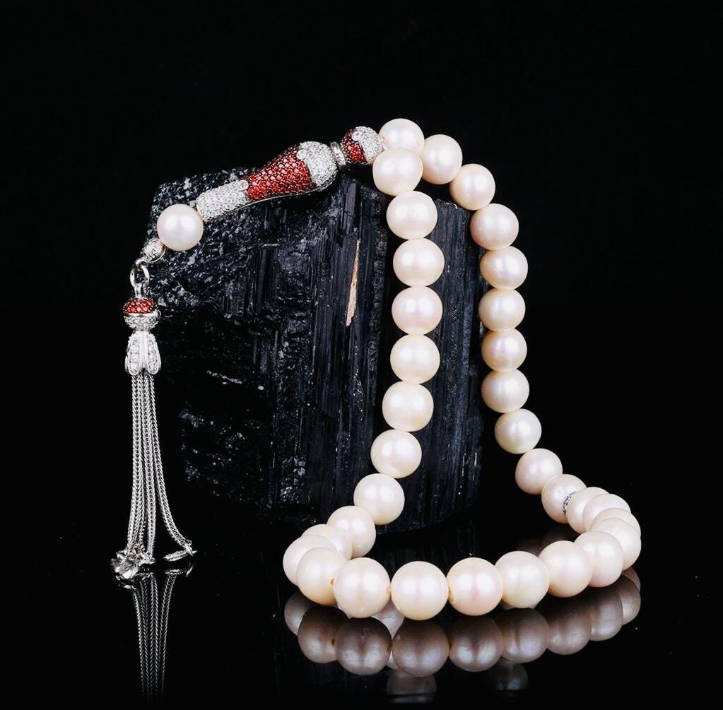 A beautiful natural cultured pearl misbaha featuring 10 mm round beads and a zircon-stone tassel. The smooth texture and balanced weight make it suitable for everyday dhikr, meditation, or gifting.