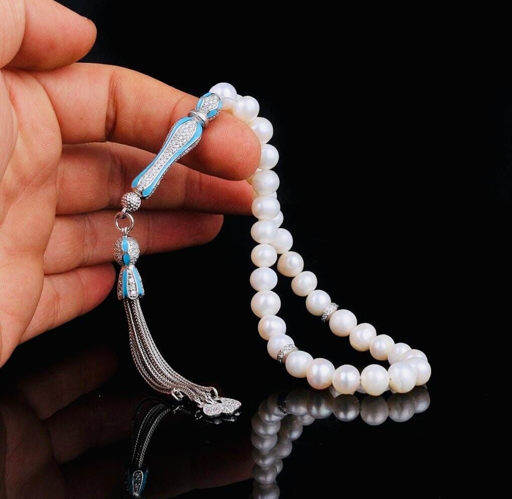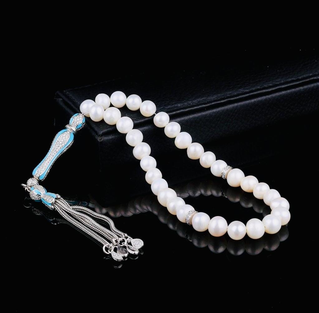 A beautifully crafted wrist-sized misbaha featuring turquoise enamel details, zircon stones, and a sterling silver tassel. Designed with smooth 8 mm cultured pearl beads, perfect for daily dhikr, meditation, gifting, or personal use.