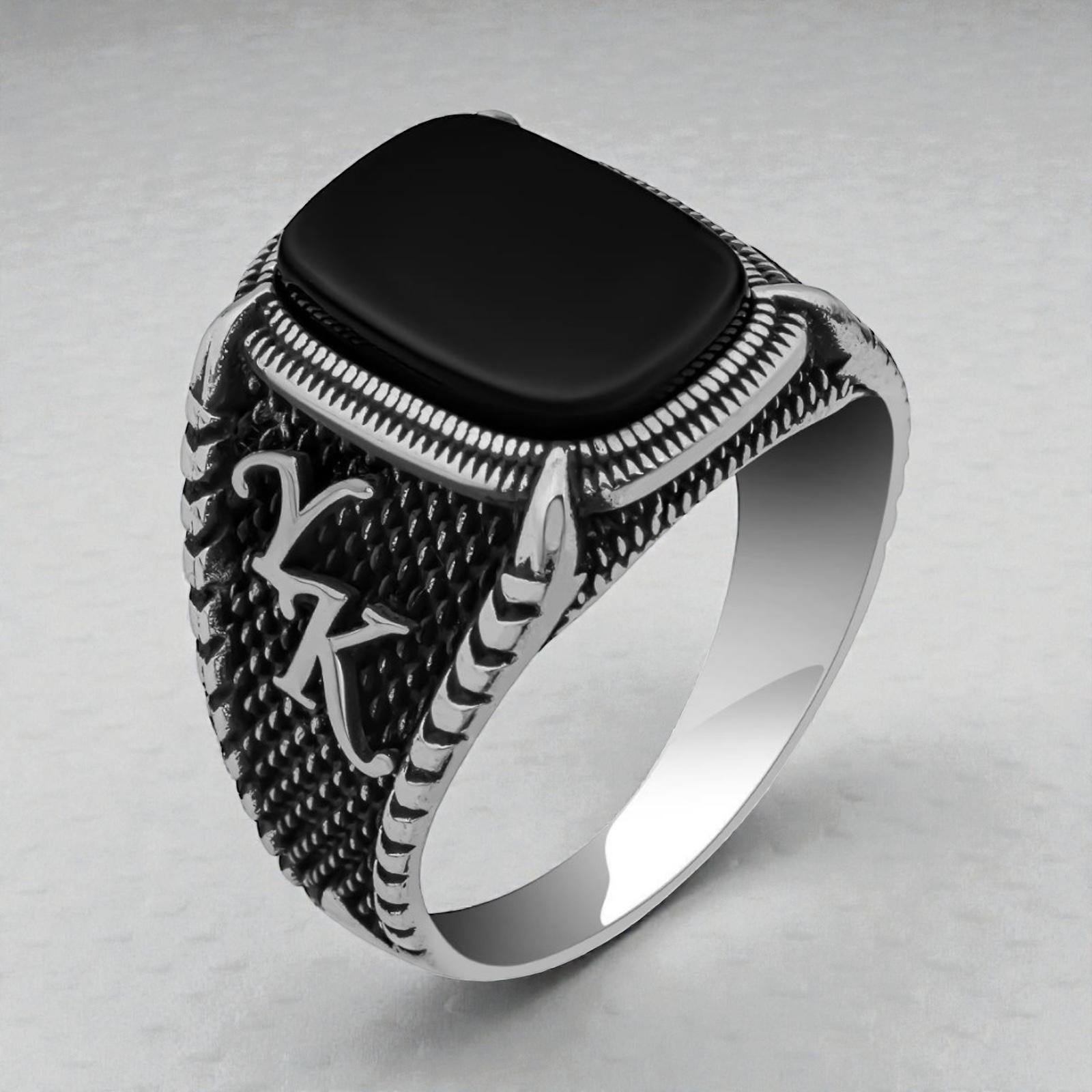 A sleek and masculine 925 sterling silver men’s ring featuring a polished black onyx stone and personalized initial engraving on the side. Perfect for everyday wear or as a meaningful gift, offering both elegance and strength in one design.