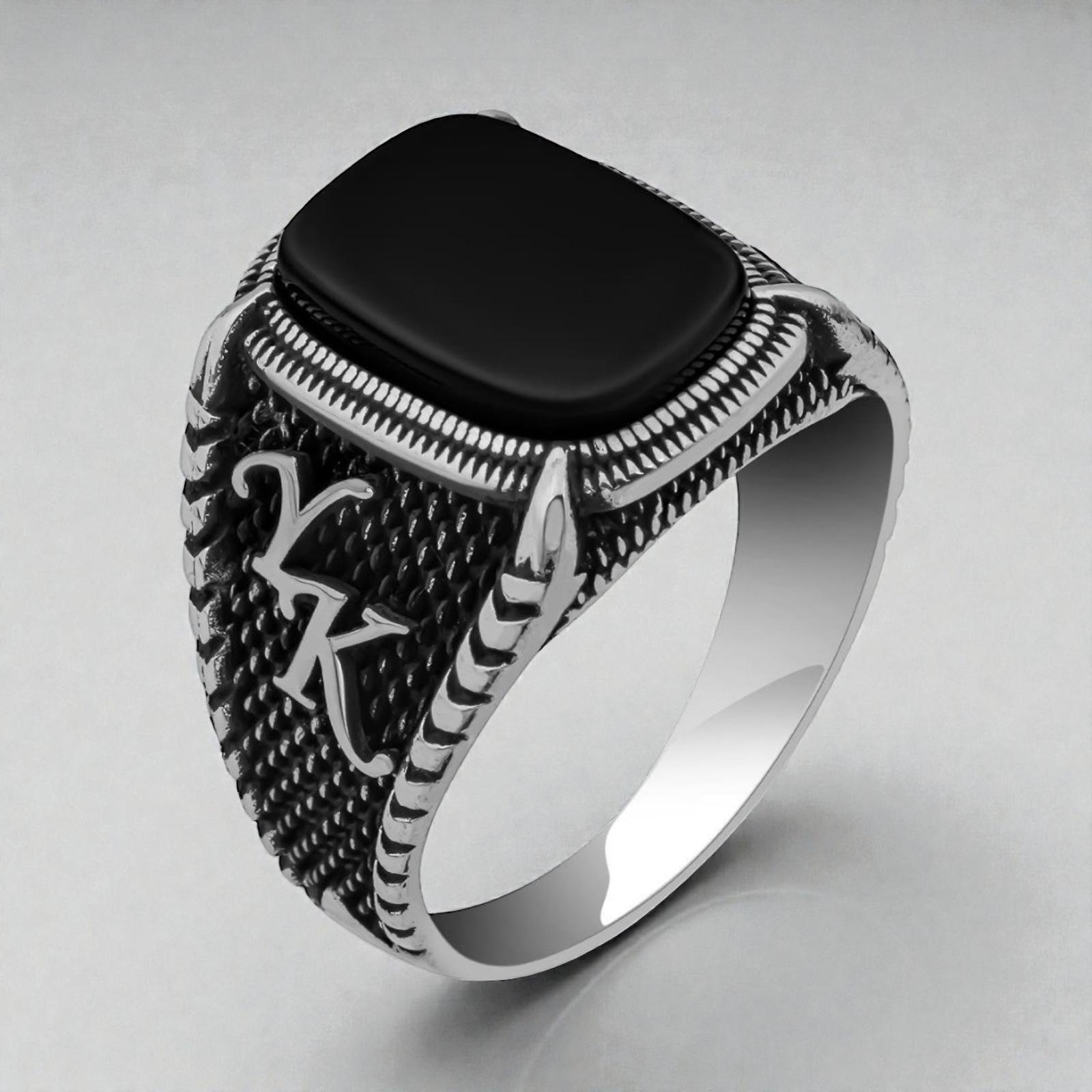925 Sterling Silver Black Onyx Men’s Ring with Custom Initial