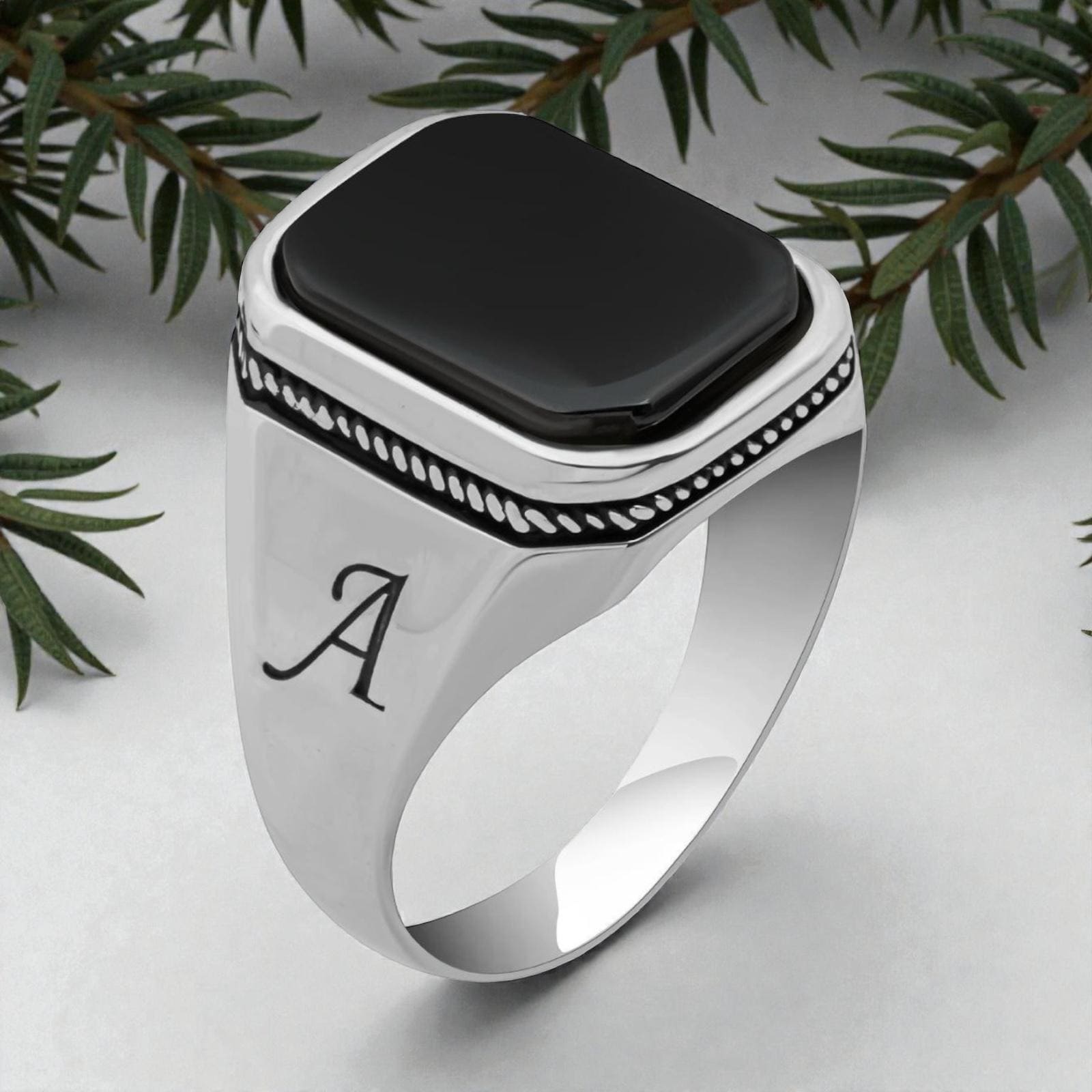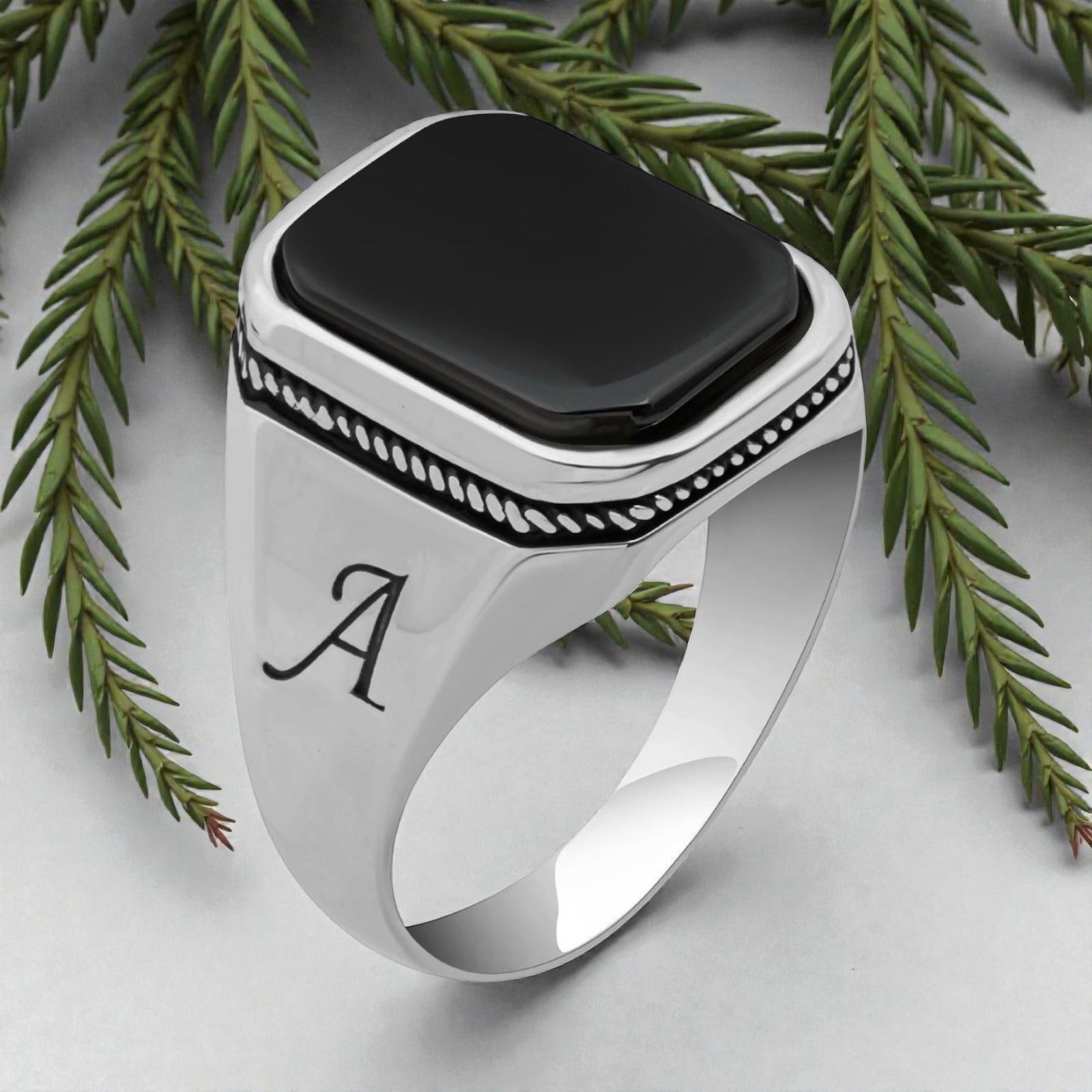 925 Sterling Silver Men’s Ring with Black Onyx Stone & Custom Initial