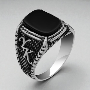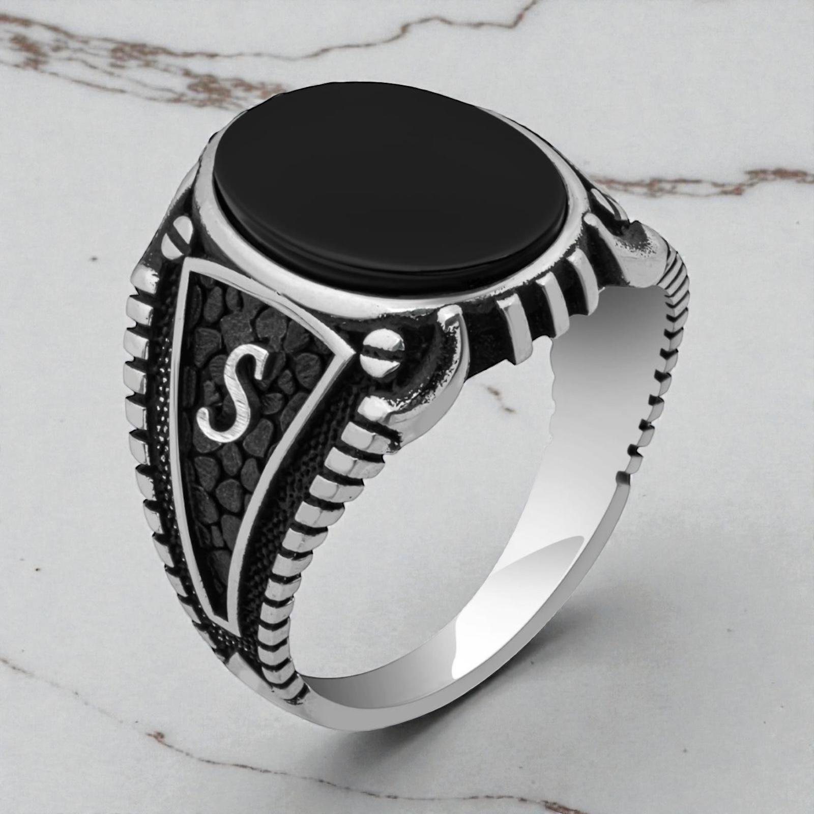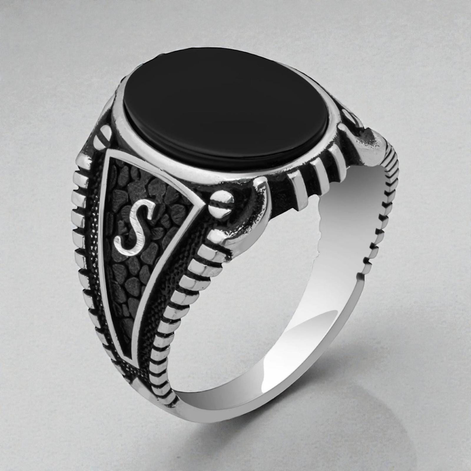 Details * Material: 925 sterling silver * Stone: Black onyx * Personalized side initial * Smooth, minimal design * Comfortable fit * Comes in a gift box