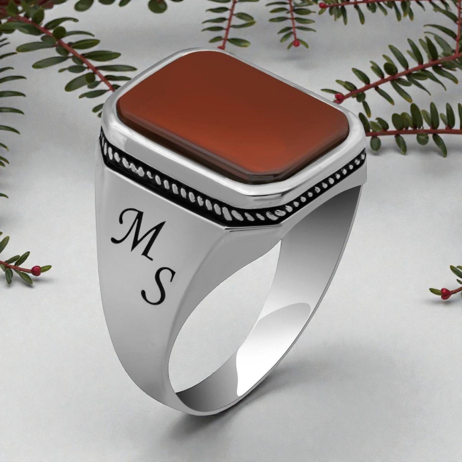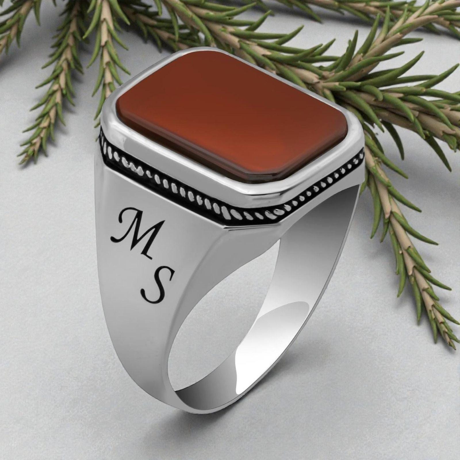 925 Sterling Silver Men’s Ring with Red Agate Stone & Custom Initials