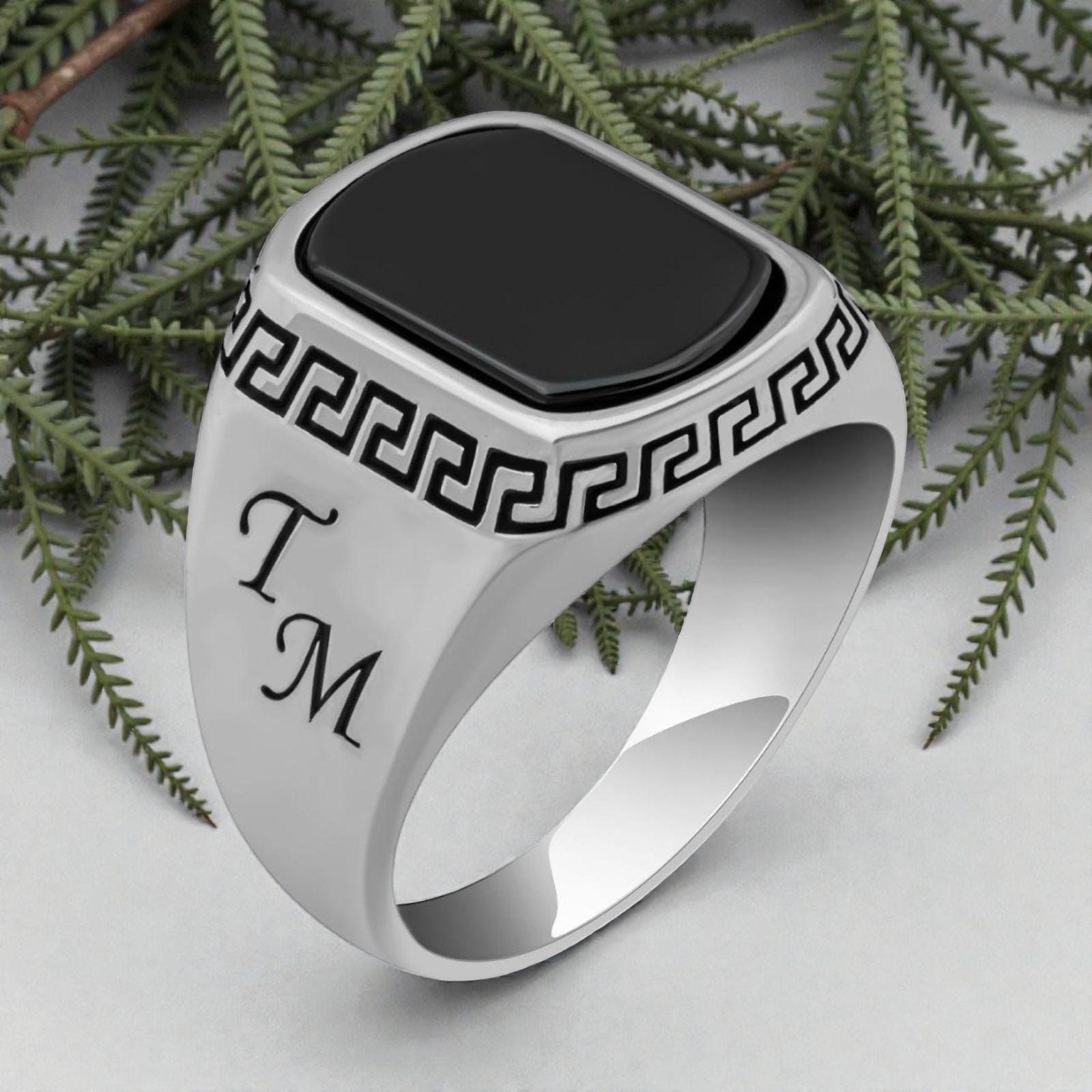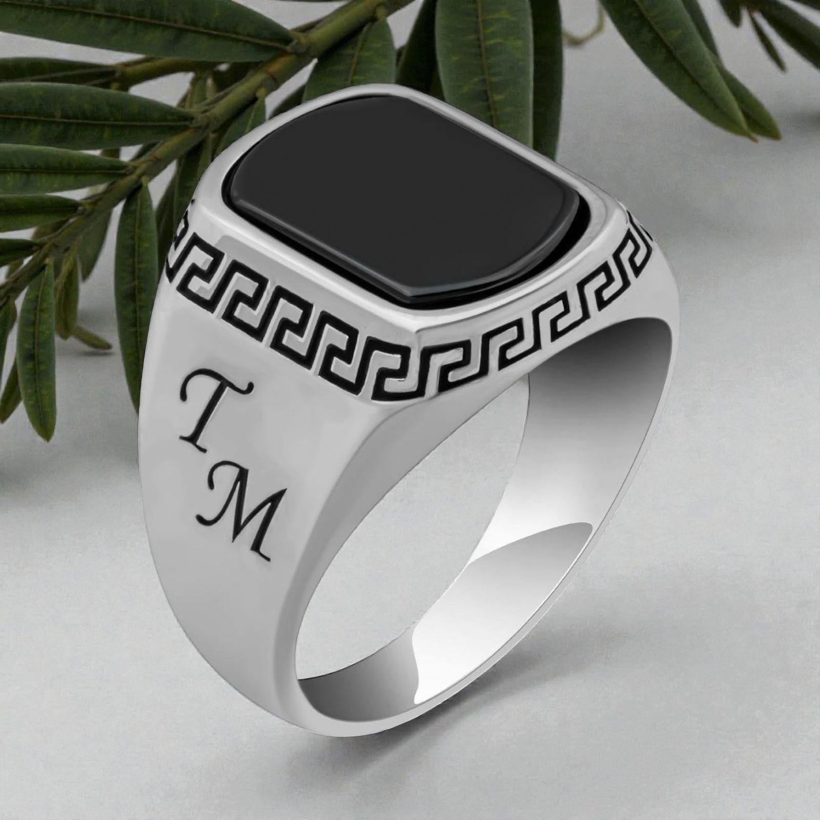 925 Sterling Silver Men’s Ring with Black Onyx Stone & Custom Initials – Greek Motif Design