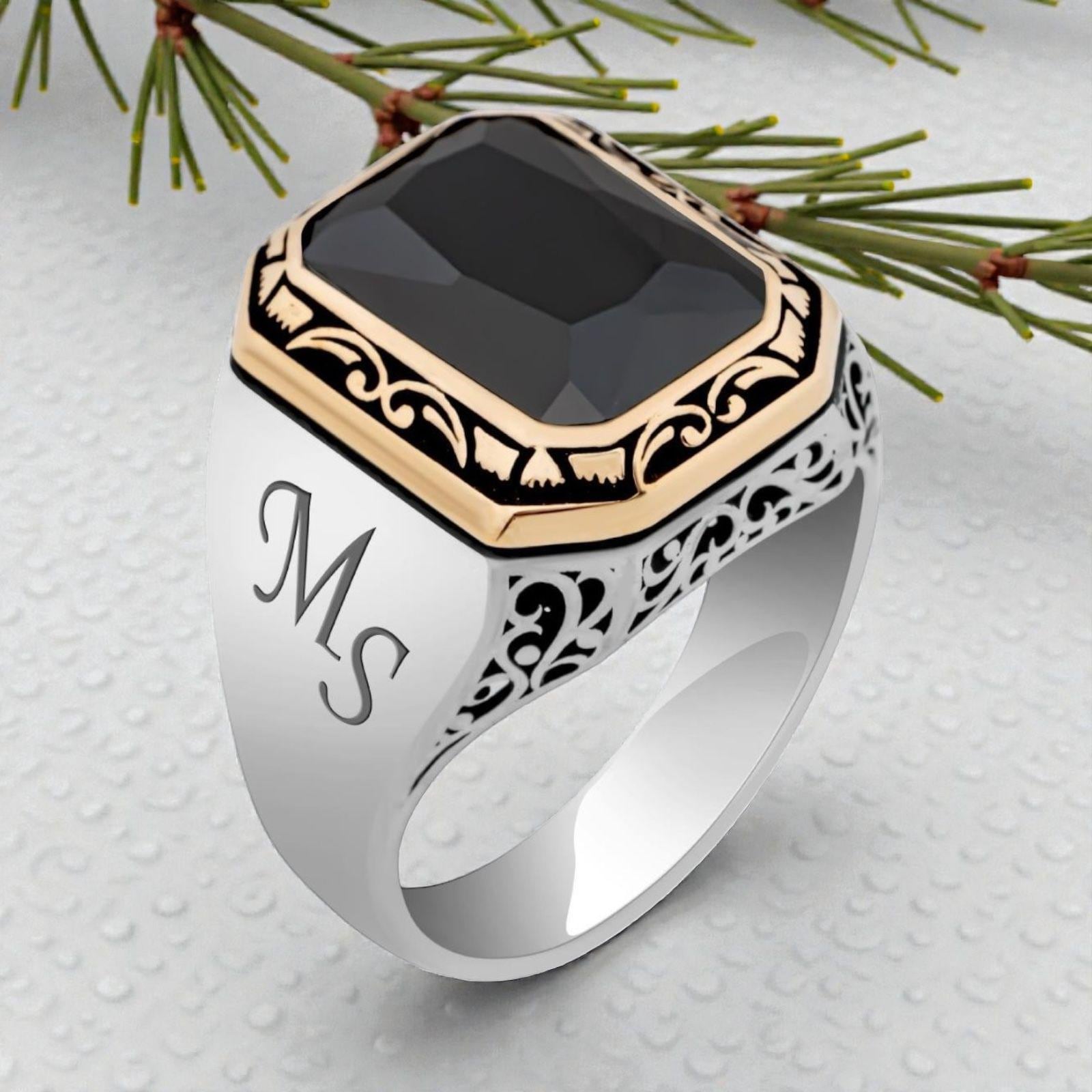 A bold and elegant 925 sterling silver men’s ring featuring a black square-cut zircon stone, framed with gold-detailed ornamental design. The sides can be customized with your chosen initials, making it a unique and meaningful personalized gift.