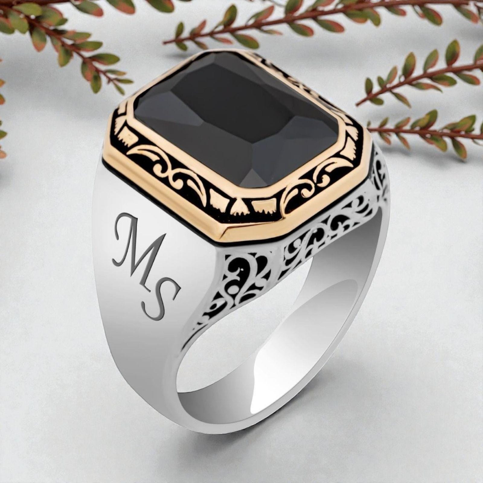 Details * Material: 925 sterling silver * Stone: Black square zircon * Customizable initials on sides * Gold-detailed ornamental frame * Fine handcrafted work * Comes in a gift box