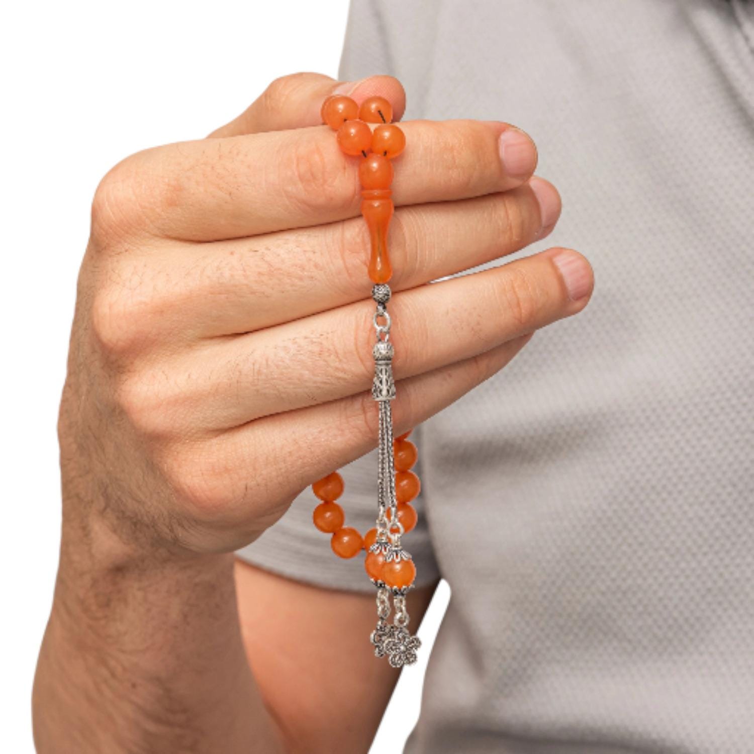 Handmade Orange Round Pressed Amber Prayer Beads • Silver Tassel Misbaha • 33 Beads Tesbih Gift for Men
