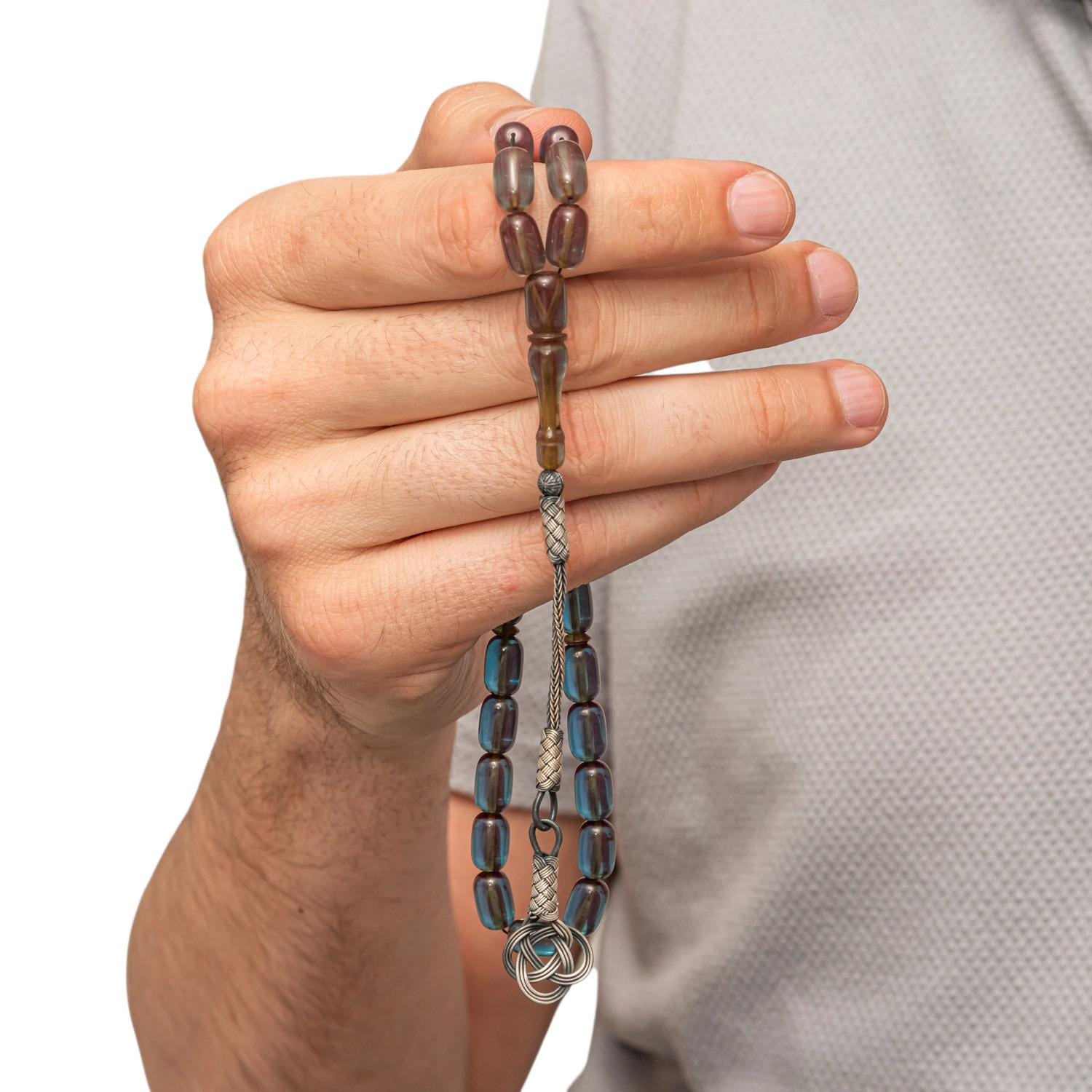 Blue Capsule Amber Misbaha with 925 Silver Kazaz Tassel – Handmade Islamic Prayer Beads Tesbih This handmade Blue Capsule Amber Misbaha features a beautiful blend of deep blue tones and smooth capsule–cut beads for a comfortable and elegant prayer experience. Finished with a 925 sterling silver Kazaz tassel, it combines traditional craftsmanship with a modern aesthetic.