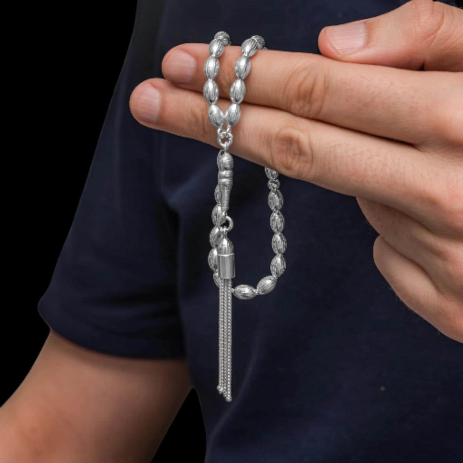 This 925 sterling silver Arpa Cut Striped Men’s Misbaha is handcrafted with precision and elegance. Its striped oval beads give it a refined look, while the detailed tassel adds balance and a smooth pull during use.