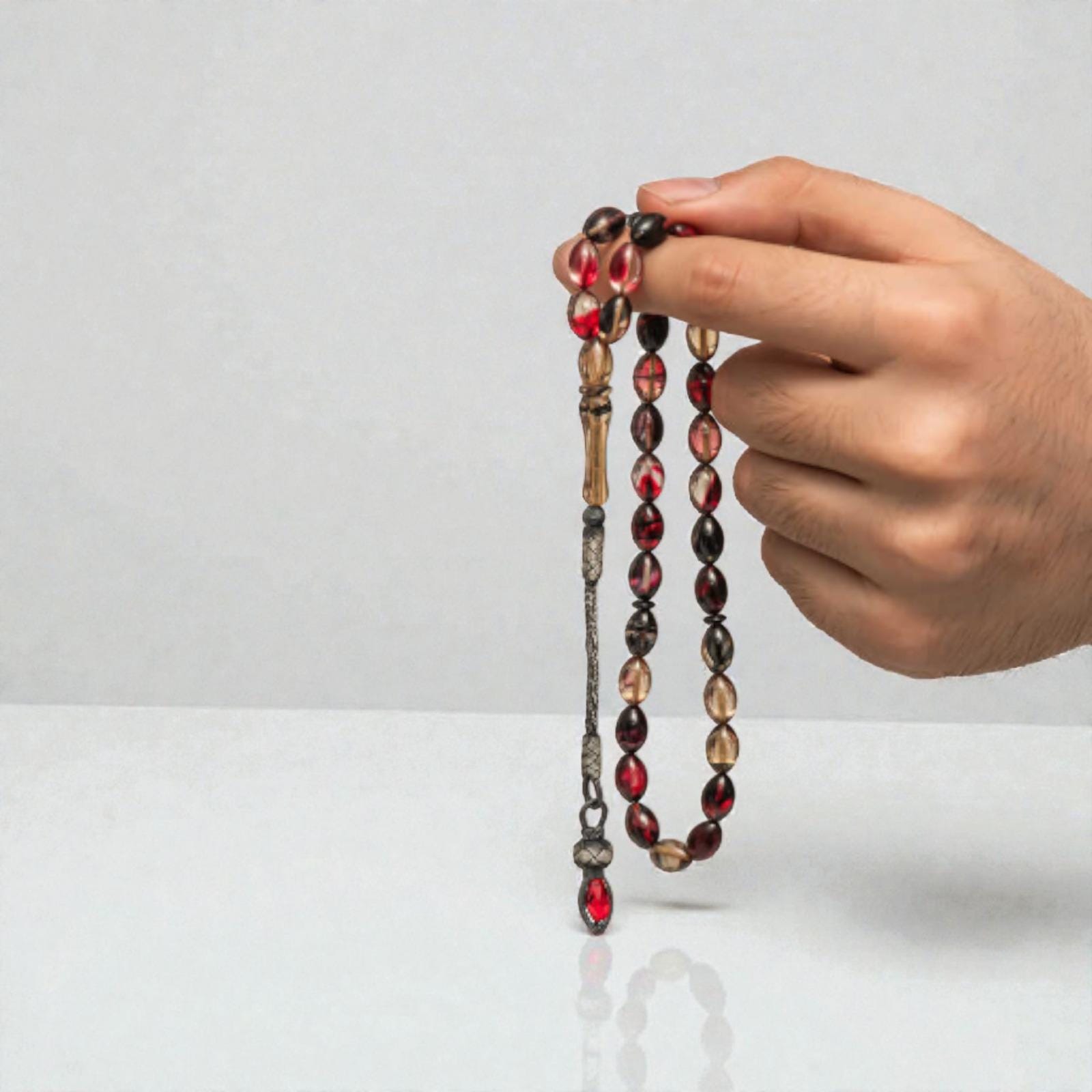 1000 Silver Kazaz Tassel Red Black Ottoman Style Prayer Beads – Handmade Sıkma Kehribar Misbaha
