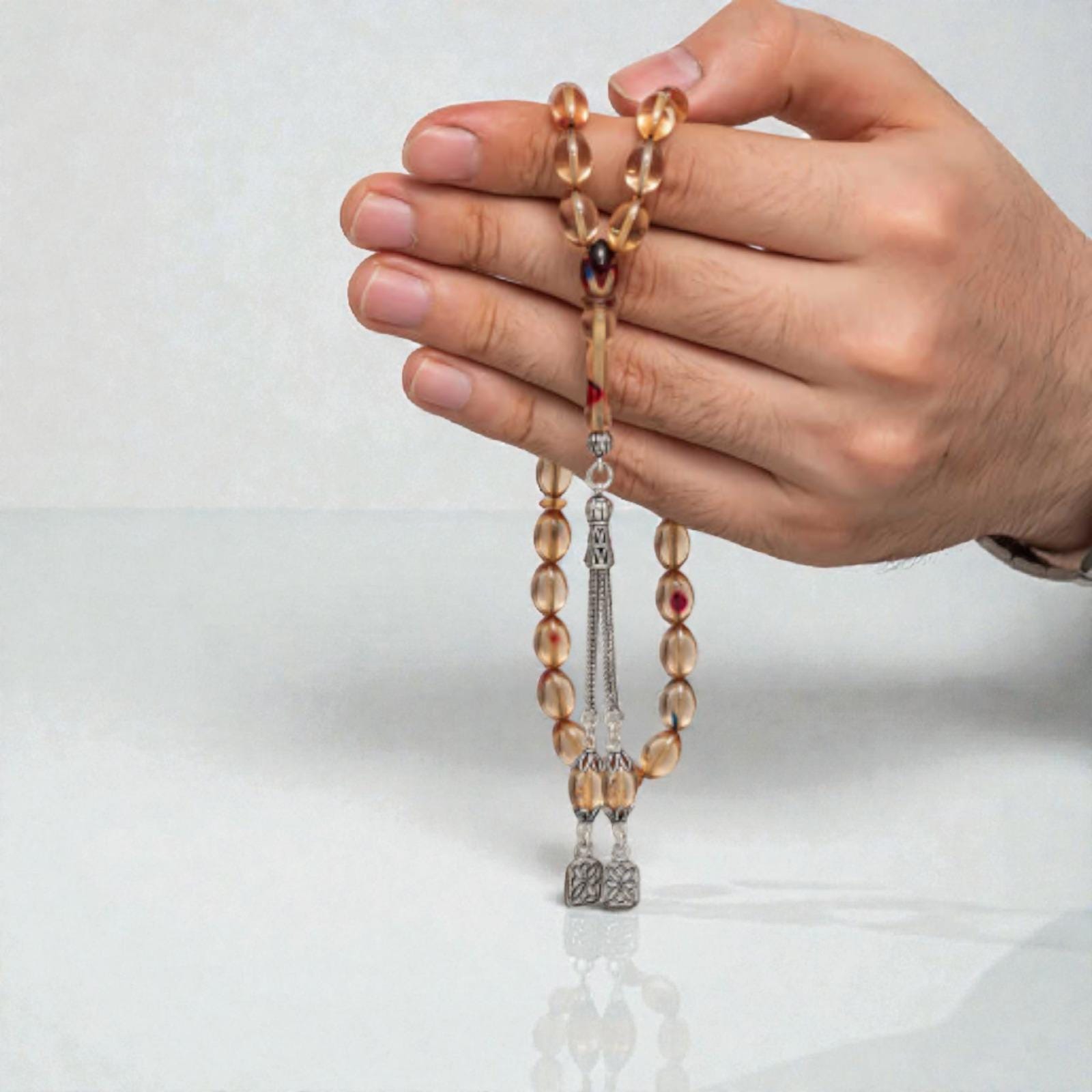 Handmade Sıkma Amber Prayer Beads (Tesbih) with a 925 sterling silver tassel. This elegant misbaha is crafted by skilled artisans and features warm amber tones, smooth oval beads, and a traditional silver tassel. Perfect for personal use, daily meditation, spiritual practice, or as a meaningful gift for men.