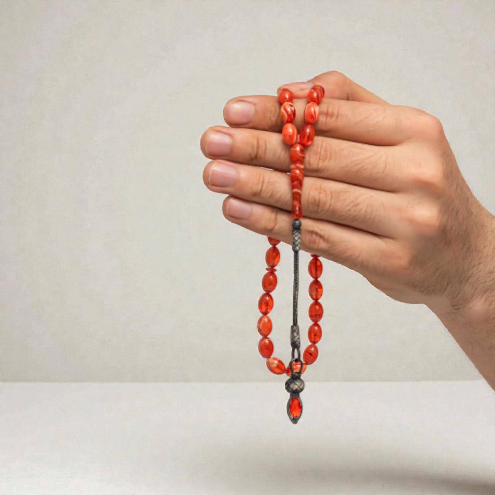 This handcrafted red Amber-style Misbaha features a beautifully woven 1000 silver Kazaz tassel made by skilled artisans. Amber-style beads warm in the hand and slightly change tone over time, making this piece perfect for daily use, gifting, or collection. Comes in a premium gift box.