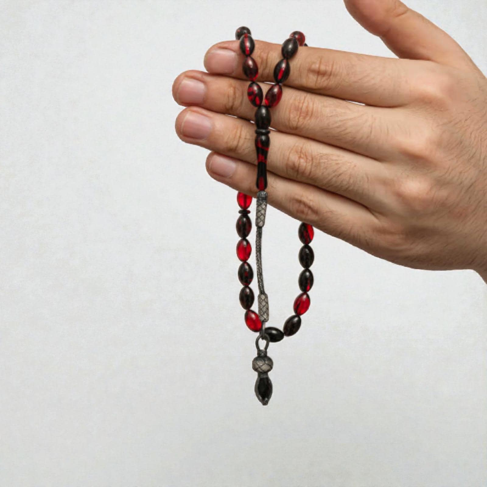 Handcrafted pressed amber misbaha featuring deep red and black tones paired with a 1000 silver Kazaz tassel. Each bead is carefully shaped for smooth handling and an elegant shine. A perfect accessory for daily use, collection display, or as a meaningful gift for men on birthdays, anniversaries, Father’s Day and more.