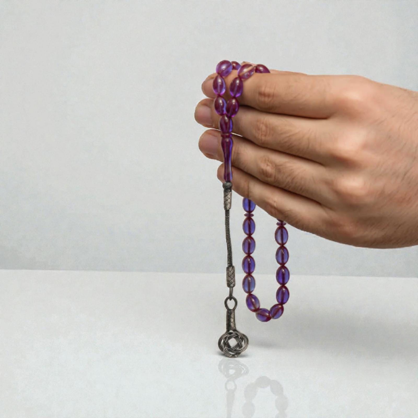 This handmade purple resin (sıkma kehribar style) prayer beads set is crafted with high-quality materials and completed with a 1000 silver Kazaz tassel. Lightweight, smooth, and comfortable to use — perfect for daily dhikr, meditation, or as a meaningful gift for men. A unique accessory for collectors, tasbih lovers, and anyone who enjoys handcrafted artistry.