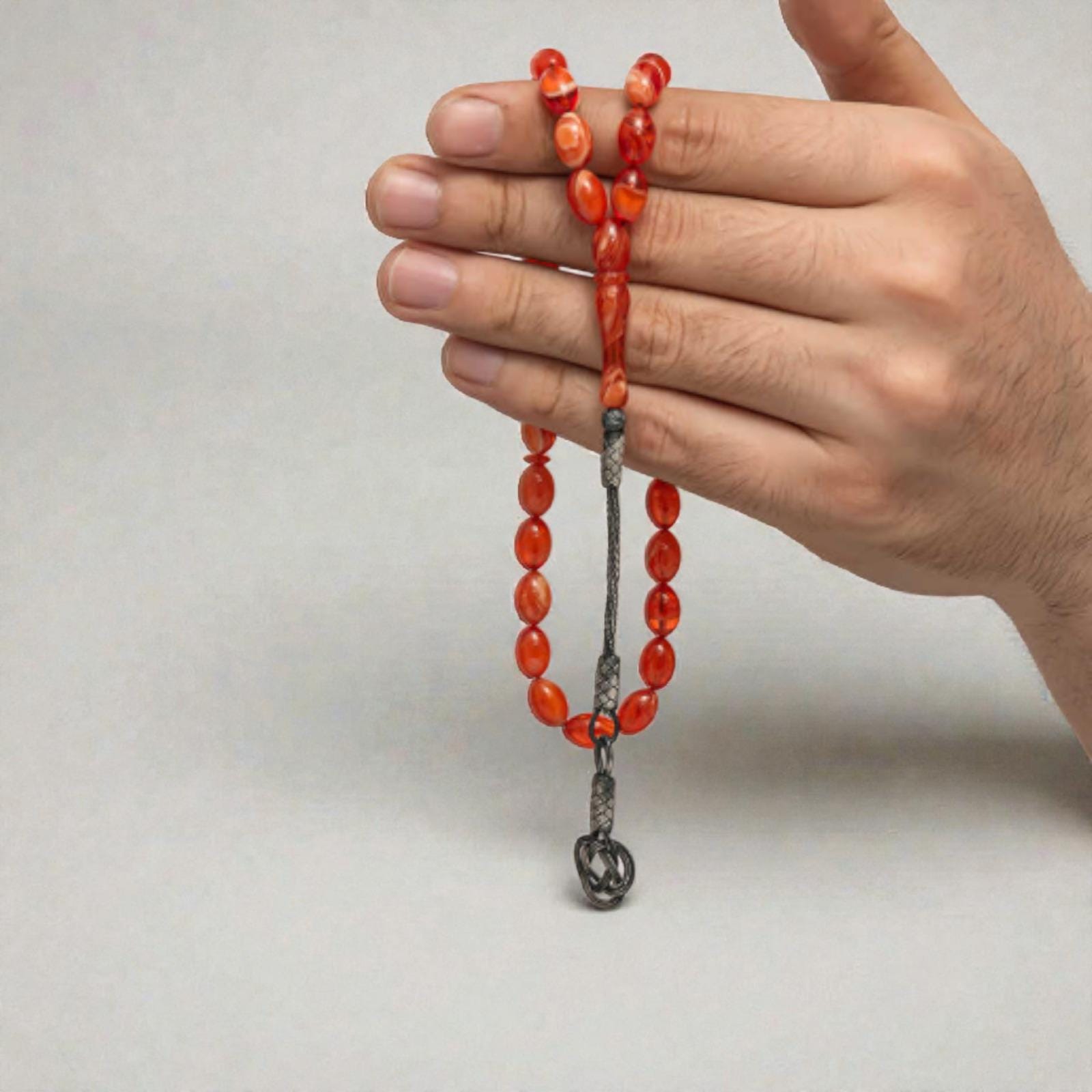 This Handmade Silver Kazaz Tassel Sıkma Kehribar Misbaha is crafted with great attention to detail by traditional Turkish artisans. Each bead is shaped from high-quality sıkma kehribar resin, known for its warm color transitions and smooth touch. The 1000-grade silver Kazaz knot tassel adds a luxurious, authentic finish.