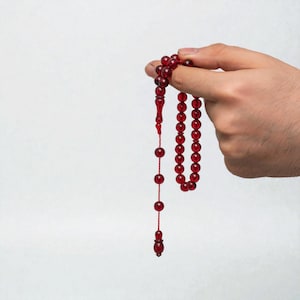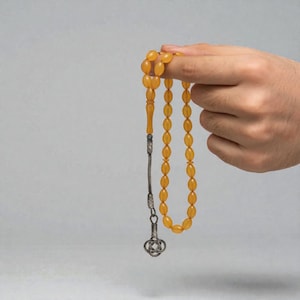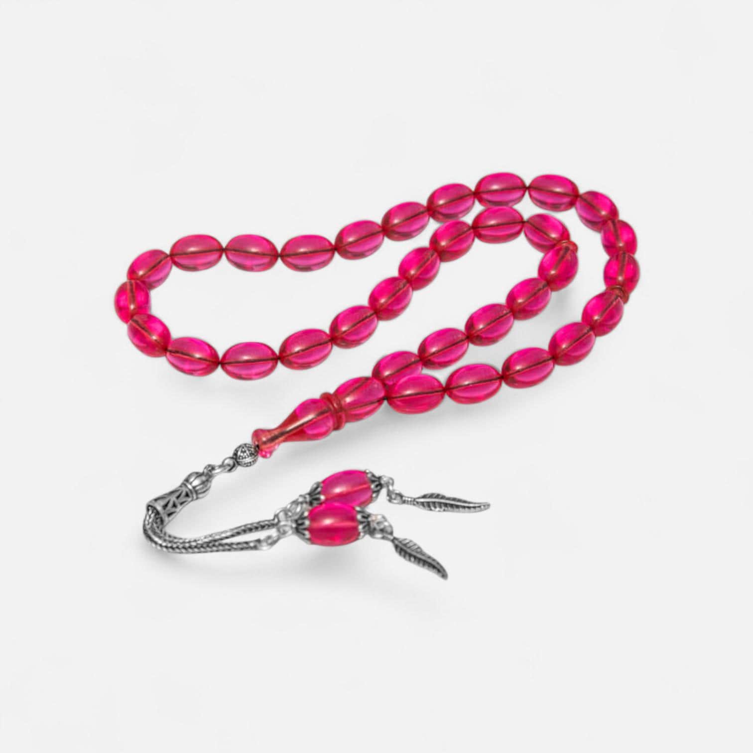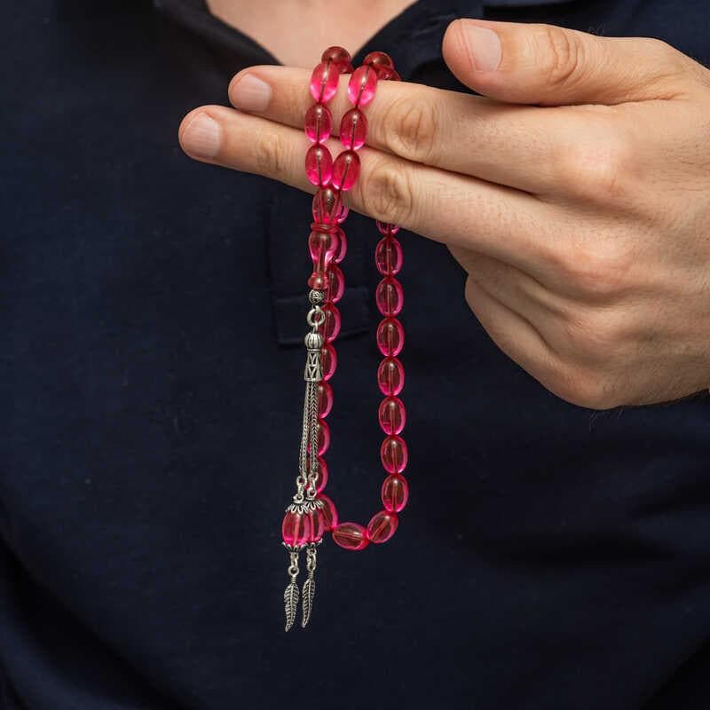 A handmade Pink Fire Amber Tesbih featuring elegant silver tassels and vibrant transparent beads. This premium worry bead set offers a smooth touch, bright reflections, and a refined aesthetic for daily use, meditation, or gifting. Perfect for collectors, spiritual use, or anyone who appreciates artisanal craftsmanship.
