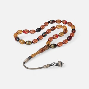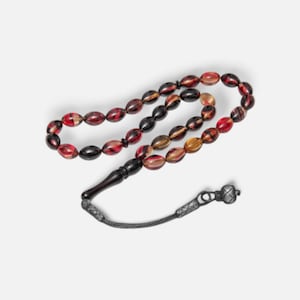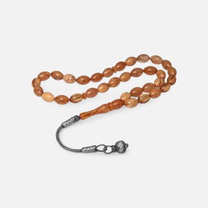This handmade Fire Amber Misbaha features bright, transparent amber tones that shine beautifully under light. Each oval-cut bead is crafted with precision, providing a smooth, balanced feel during use. The silver tassel adds an elegant touch, making this piece suitable for daily use, meditation, spiritual practice, or gifting.