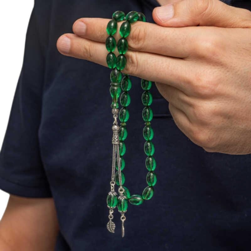 This handcrafted Green Fire Amber Misbaha features vibrant translucent beads paired with a 925 sterling silver tassel. Designed for smooth handling and daily use, it offers both spiritual comfort and an elegant aesthetic. A meaningful gift for him, perfect for prayer, meditation or collection. Note: Tassel tip design may vary depending on stock.