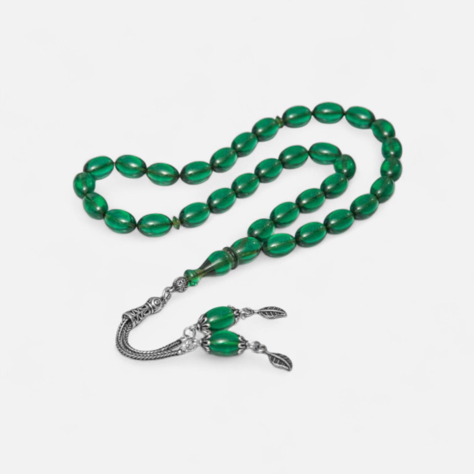 Green Fire Amber Prayer Beads with Silver Tassel, Handmade Misbaha