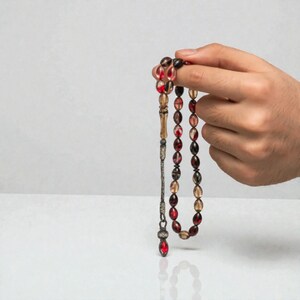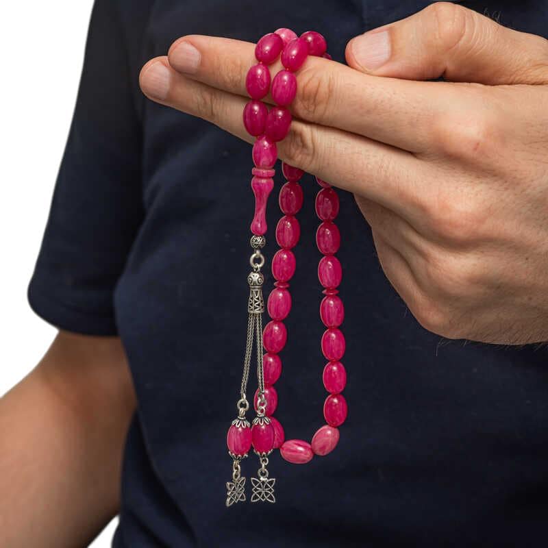 A beautifully handcrafted Pink Sıkma Amber Tesbih with capsule-cut beads and a detailed silver tassel. Its smooth texture offers a comfortable flow while the warm pink tones give the piece a modern, elegant character. Perfect for daily use, prayer, meditation, or as a meaningful gift for loved ones. Each bead is shaped with care, bringing traditional craftsmanship and contemporary aesthetics together.