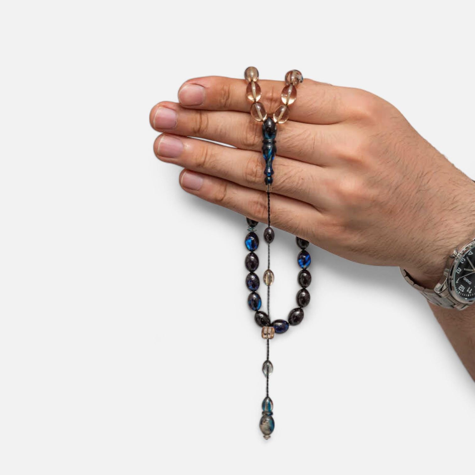 This handmade pressed amber tasbih is crafted with care and traditional workmanship. Pressed amber is known for its warm touch when used and its rich visual character, making it a popular choice among tasbih collectors and daily users.