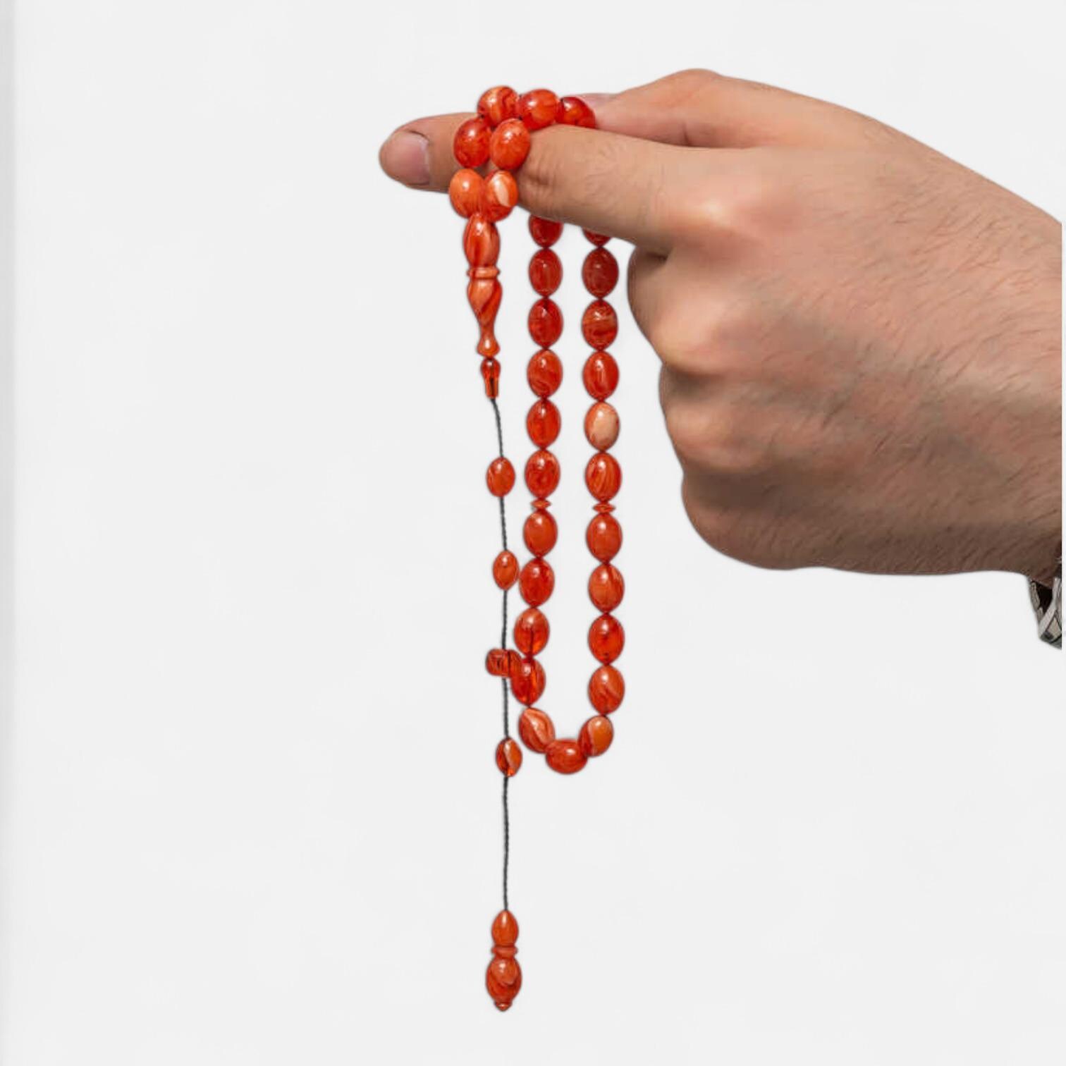 This handmade pressed amber prayer beads (misbaha) is crafted with care by skilled artisans. Pressed amber reflects the traditional look and feel of natural amber and becomes warmer in the hand during use.