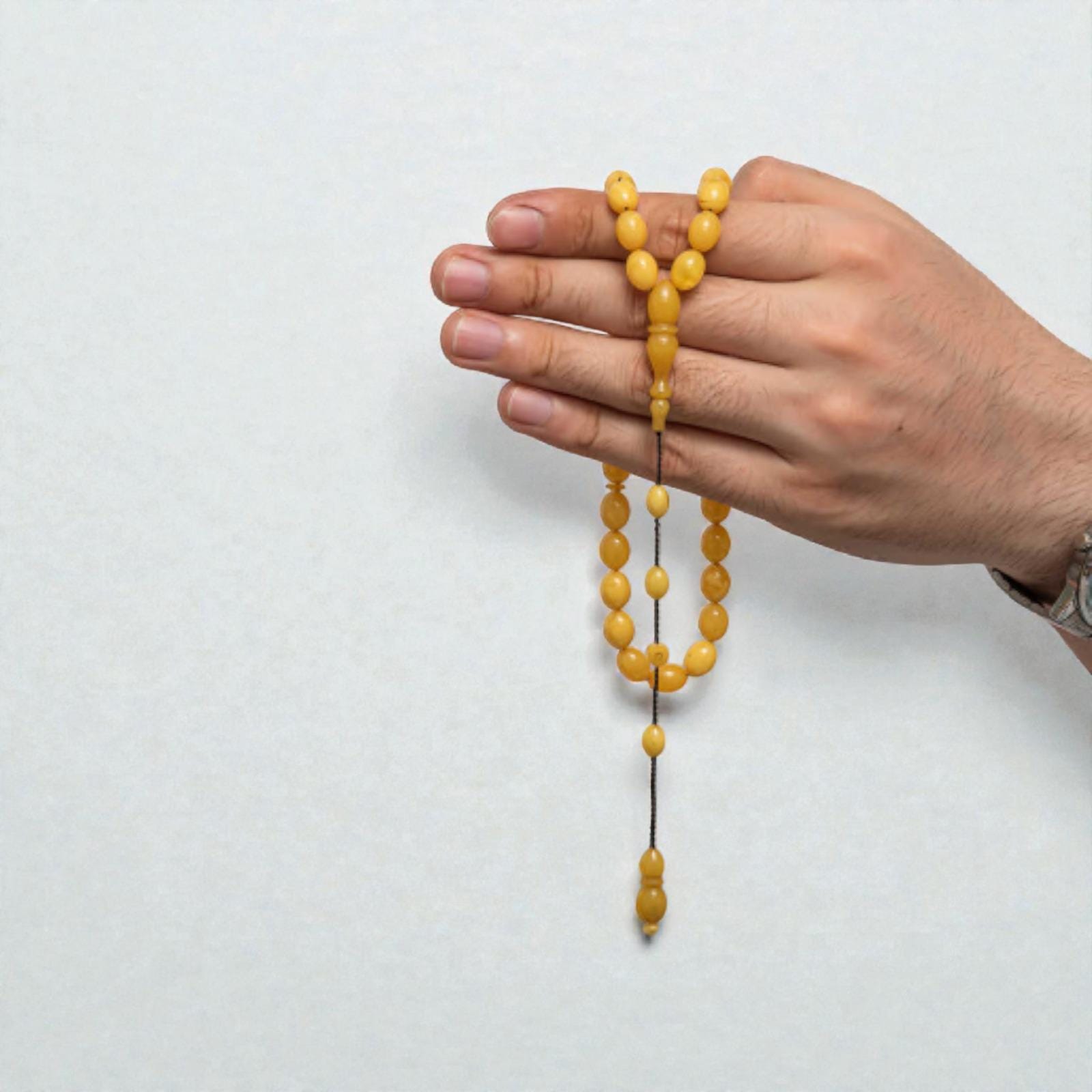 Handmade Pressed Amber Tasbih – Yellow Islamic Prayer Beads, 33 cm Men Gift