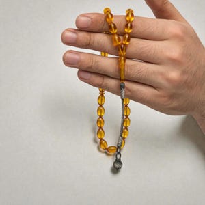 This handmade pressed amber prayer beads set features a stylish silver tassel and smooth flowing beads that offer a comfortable grip and elegant appearance. As it is used, the beads warm in hand and develop a unique character, making each piece feel personal and timeless.