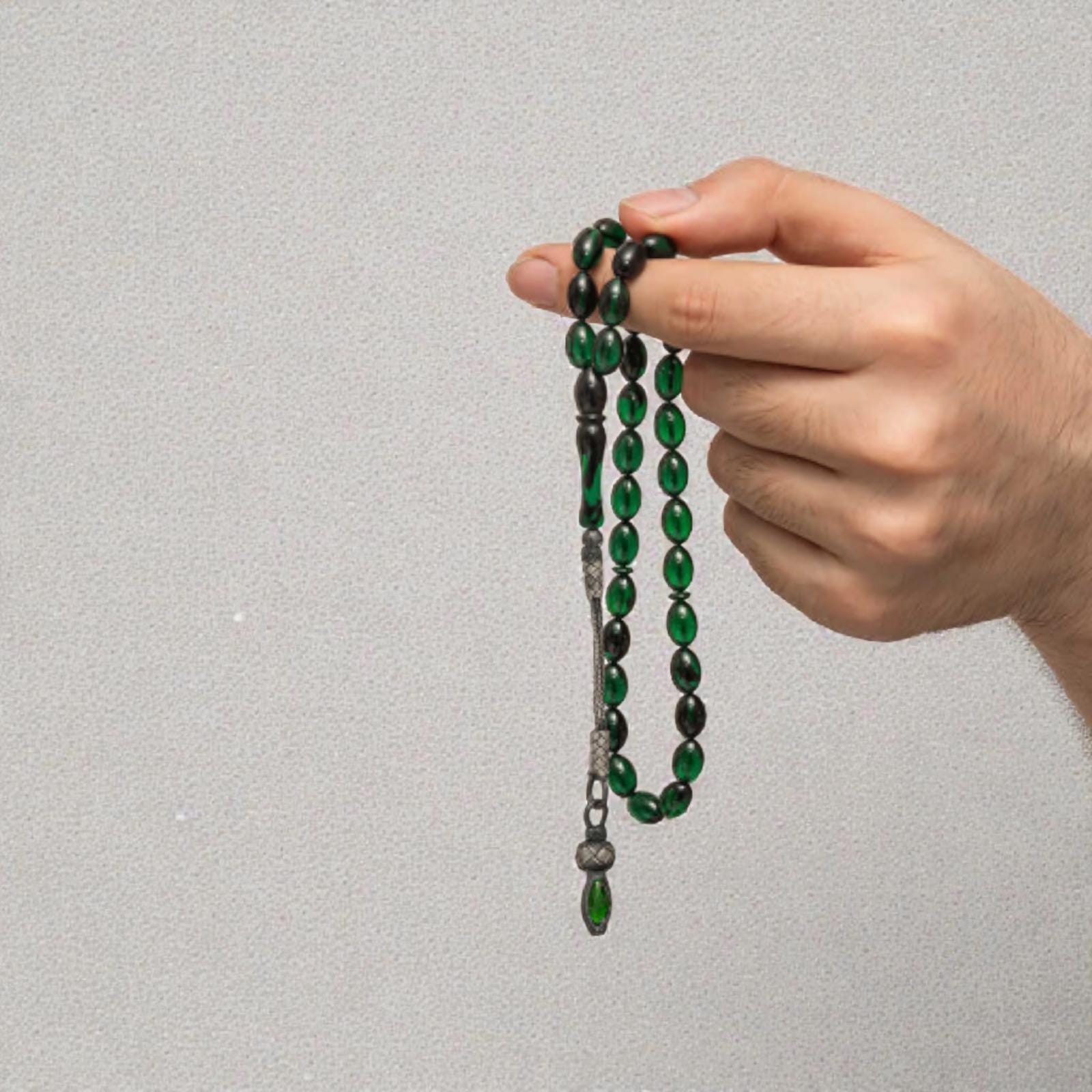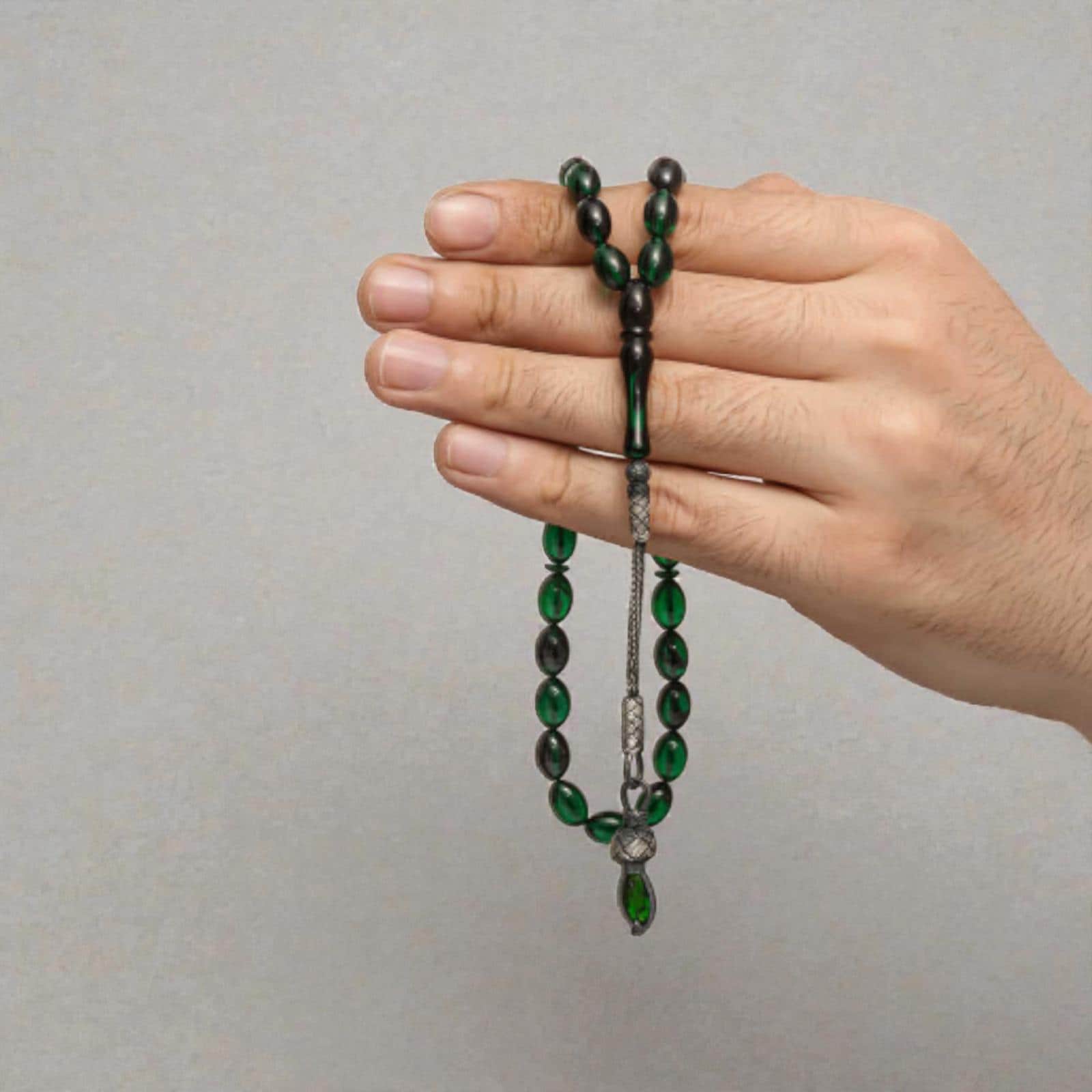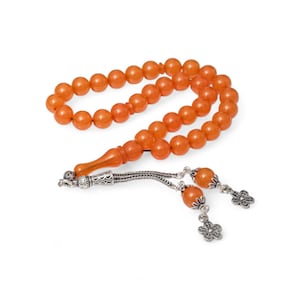 This handmade pressed amber prayer beads tasbih features a 1000 sterling silver Kazaz tassel, crafted with traditional Anatolian craftsmanship.